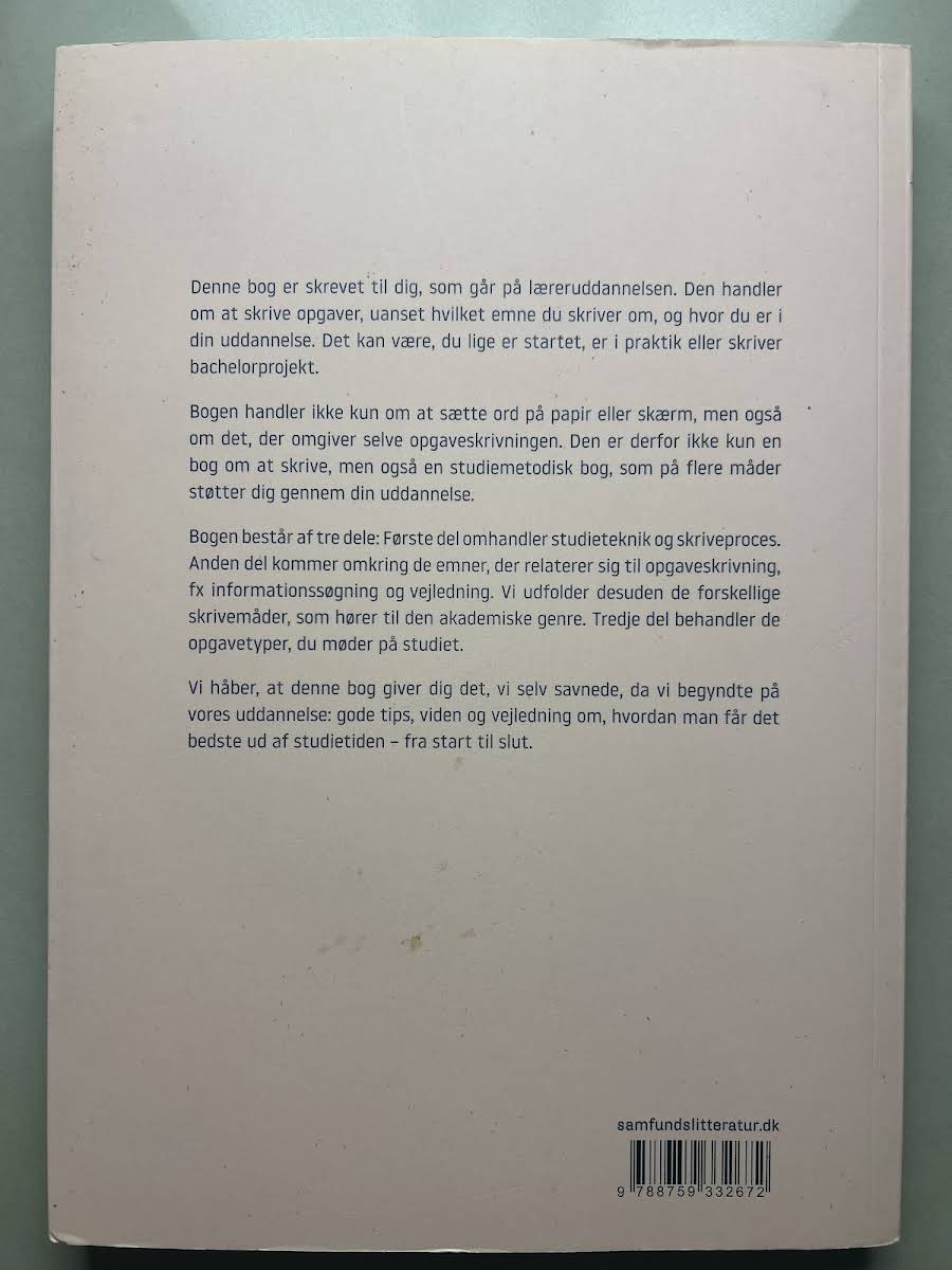 Bogen "Skriv opgaver på læreruddannelsen" er udviklet til dig, der er i gang med læreruddannelsen – uanset om du lige er startet, befinder dig i praktik eller arbejder på dit bachelorprojekt. Med et klart og struktureret perspektiv guider forfatterne Marianne Eskebæk Larsen, Jakob Matthiesen, Lone Wulff og Katja Vilien dig gennem både den kreative skriveproces og de praktiske studieteknikker, der er essentielle for akademisk succes. Bogen er inddelt i tre dele, der tilsammen giver et helhedsorienteret overblik. Den første del fokuserer på studieteknik og skriveprocessen, mens den anden del udforsker de metoder og værktøjer, der knytter sig til informationssøgning, vejledning og de forskellige akademiske skrivemåder. Den tredje del præsenterer et bredt udsnit af opgavetyper, så du er godt rustet til at håndtere de forskellige udfordringer, du møder på din videre studierejse.