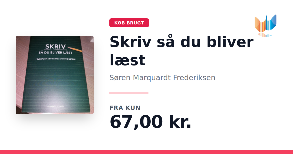 Lige nu kan du købe "Skriv så du bliver læst" af Søren Marquardt Frederiksen til kun 67,00 kr. Bogen du ser her er brugt, og i god stand. Vi har i øjeblikket kun et enkelt eksemplar til salg af "Skriv så du bliver læst", så slå til mens du kan!