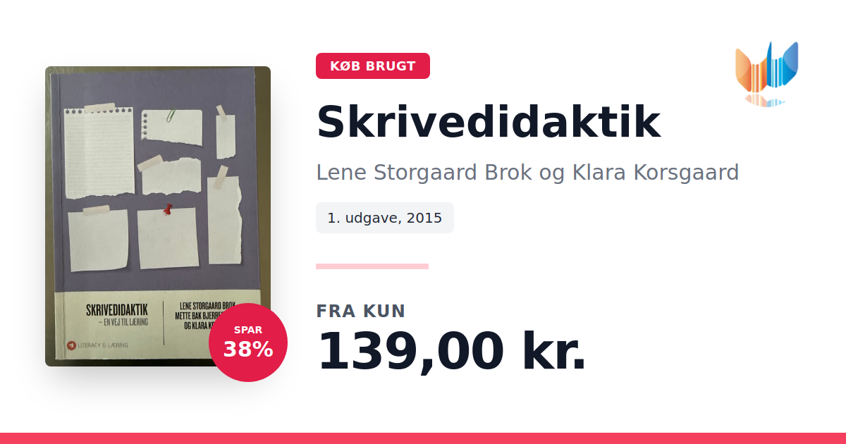 Lige nu kan du købe "Skrivedidaktik" af Lene Storgaard Brok og Klara Korsgaard til kun 139,00 kr. Du sparer hele 38% af nyprisen! Bogen du ser her er brugt, og i god stand. Vi har i øjeblikket kun et enkelt eksemplar til salg af "Skrivedidaktik", så slå til mens du kan!