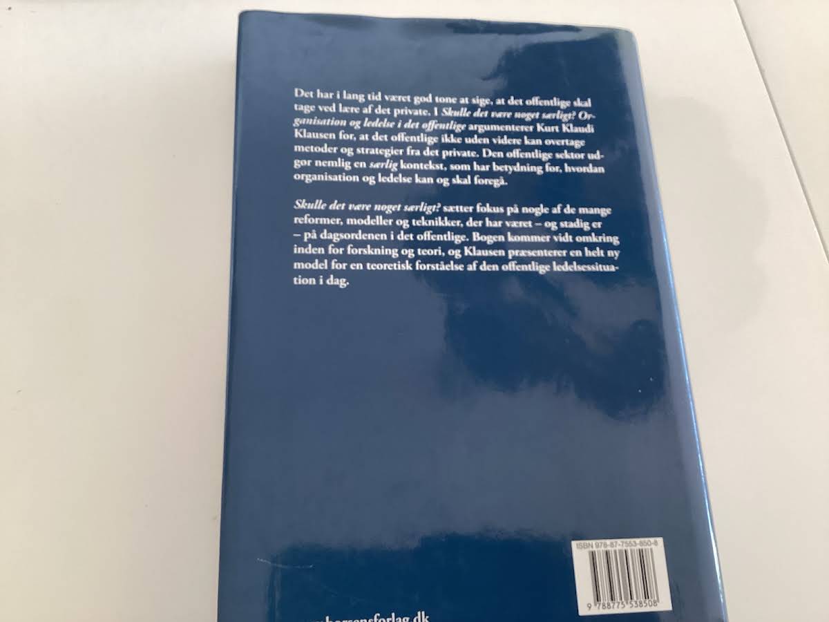 I "Skulle det være noget særligt?" præsenterer Kurt Klaudi Klausen en dybdegående analyse af organisation og ledelse i den offentlige sektor. Bogen kaster lys over, hvordan ledelsesopgaver i det offentlige adskiller sig fra dem i privat erhvervsliv, og den problematiserer overførslen af modeller, teorier og metoder uden videre. Med et nuanceret og realistisk blik udfolder Klausen de centrale problemområder og brændpunkter, som kendetegner ledelsesdebatten i offentlige institutioner. Værket giver læseren et solidt overblik over de særlige udfordringer, der følger med at lede i en offentlig organisation, og gør det klart, at en målrettet tilgang er essentiel for at håndtere den komplekse virkelighed i det offentlige landskab.
