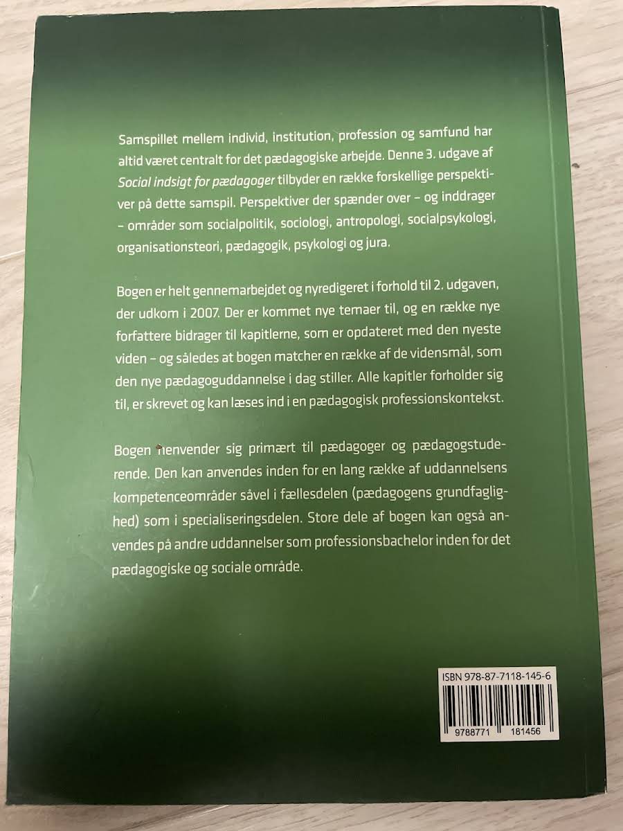 "Social indsigt for pædagoger" byder pædagogstuderende velkommen til en central lærebog, der understreger vigtigheden af at forstå samspillet mellem profession, institution og samfund. Bogen belyser, hvordan individet forholder sig til de institutionelle strukturer, og giver en nuanceret forståelse af de sociale dynamikker, der præger pædagogisk praksis. Med en solid struktur inddeles bogen i kapitler, der blandt andet omhandler emner som institutionens rolle, familiens betydning, pædagogisk praksis samt de juridiske og politiske aspekter, som påvirker det pædagogiske arbejde. Fremgangen opnås gennem inddragelse af tværfaglige perspektiver, der tilsammen giver læseren et bredt fundament inden for social indsigt. Med sine 359 sider i paperback, udgivet i 2014 af Frydenlund, er "Social indsigt for pædagoger" en uundværlig ressource for alle, der ønsker at tilegne sig en dybdegående forståelse af de komplekse sammenhænge mellem individ, institution og samfund. Jens Horsholt Mikkelsen har med denne udgivelse skabt et værk, der kombinerer teoretiske og praktiske diskussioner og giver læseren et stærkt redskab til at navigere i den pædagogiske hverdag.