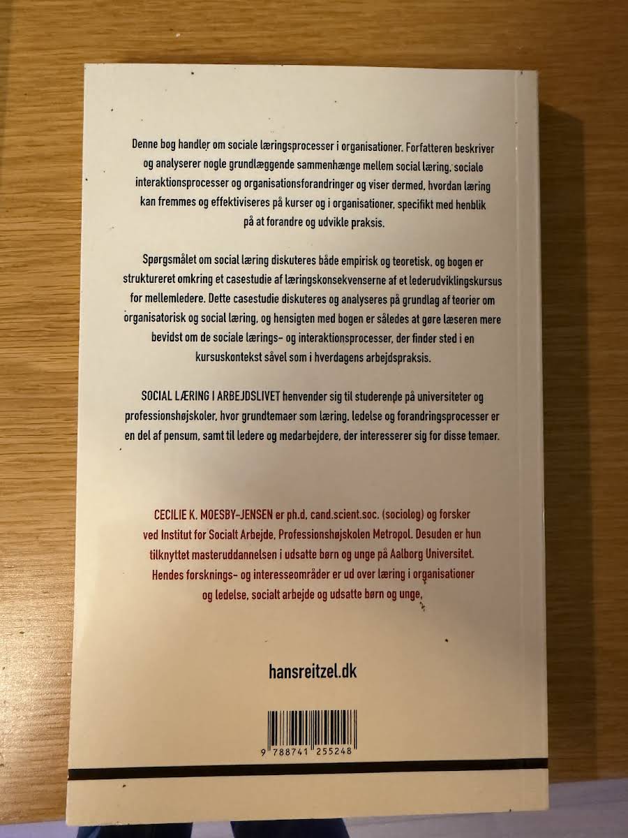 "Social læring i arbejdslivet" dykker ned i, hvordan sociale læringsprocesser påvirker både den enkelte og organisationen. Bogen kombinerer en teoretisk og empirisk tilgang for at belyse de centrale sammenhænge mellem social læring, interaktionsprocesser og organisatoriske forandringer. Gennem udvalgte cases illustreres, hvordan læring kan styrkes og gøres mere effektiv i både kursusforløb og den daglige arbejdspraksis. Målgruppen omfatter studerende på universiteter og professionshøjskoler, hvor nøgletemaer som læring, ledelse og forandringsprocesser indgår i pensum, men bogen er også relevant for ledere og medarbejdere med interesse for disse emner. Med sin dybdegående analyse og praktiske eksempler giver Cecilie K. Moesby-Jensen læseren et værdifuldt indblik i, hvordan man gennem social læring kan understøtte og udvikle moderne organisationspraksisser.