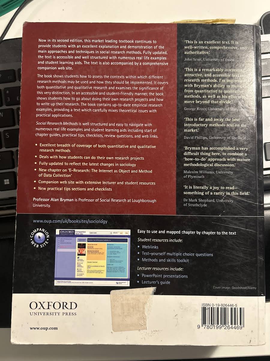 Social Research Methods af Alan Bryman er nu i sin 2. udgave og anerkendt som en grundbog inden for samfundsvidenskabelig metode. Bogen præsenterer med klarhed de centrale teorier og teknikker i både kvalitativ og kvantitativ forskning, så du får en solid forståelse af undersøgelsesdesign, dataindsamling og analyse. Udgivet i 2004 af Oxford University Press i paperback, omfatter den 608 sider spækket med faglig indsigt og praksisnære perspektiver. Den fuldt opdaterede udgave er trykt i to farver for at fremhæve nøglebegreber og skabe bedre overblik. Undervejs møder du talrige eksempler fra virkelige studier samt en række studiehjælpemidler, der guider dig fra teori til anvendelse og støtter din læring på hvert enkelt kapitel.