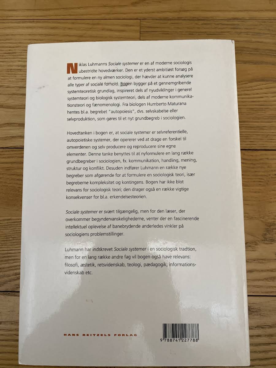 Niklas Luhmanns "Sociale systemer" fra 2000 præsenterer hans gennemgribende systemteoretiske tilgang til at forstå sociale kontakter. I denne paperback, udgivet af Hans Reitzels Forlag og omfattende 568 sider, udfolder Luhmann sin generelle teori om sociale systemer, hvor han omformulerer centrale sociologiske begreber. Bogen giver en teoretisk ramme, der kan anvendes til at analysere alt fra tilfældige møder til komplekse samfundsstrukturer. Ved at gentænke begreber som kommunikation, handling, mening og konflikt, introducerer Luhmann nye perspektiver, der beriger den sociologiske teoridannelse.