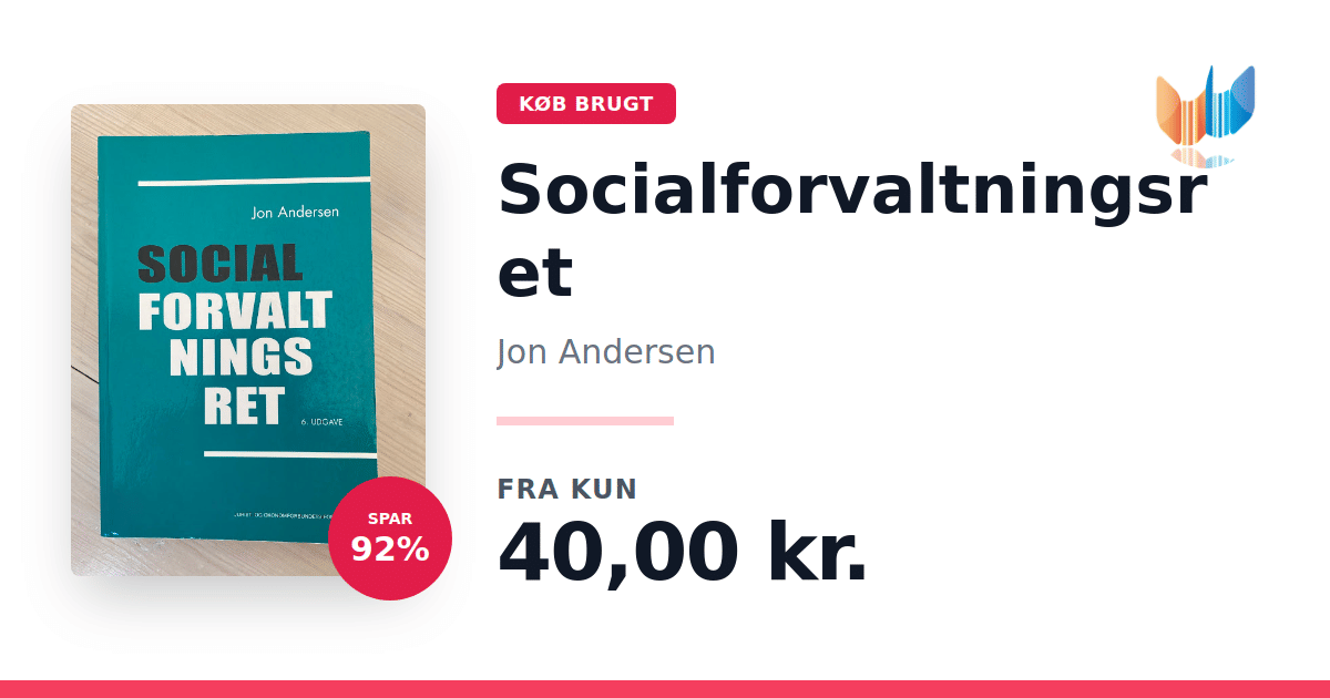 Lige nu kan du købe "Socialforvaltningsret" af Jon Andersen til kun 40,00 kr. Du sparer hele 92% af nyprisen! Bogen du ser her er brugt, og i perfekt stand. Vi har i øjeblikket 10 eksemplarer til salg af "Socialforvaltningsret", så husk at se de forskellige udgaver.
