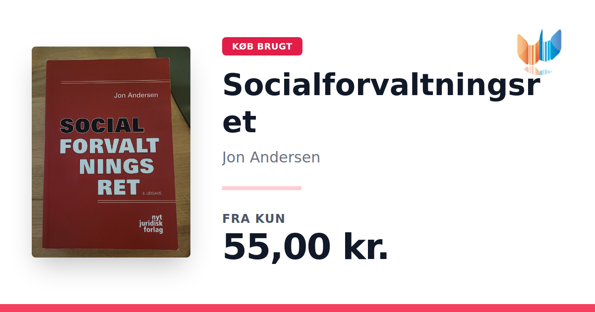 Lige nu kan du købe "Socialforvaltningsret" af Jon Andersen til kun 55,00 kr. Bogen du ser her er brugt, og i god stand. Vi har i øjeblikket 5 eksemplarer til salg af "Socialforvaltningsret", så husk at se de forskellige udgaver.