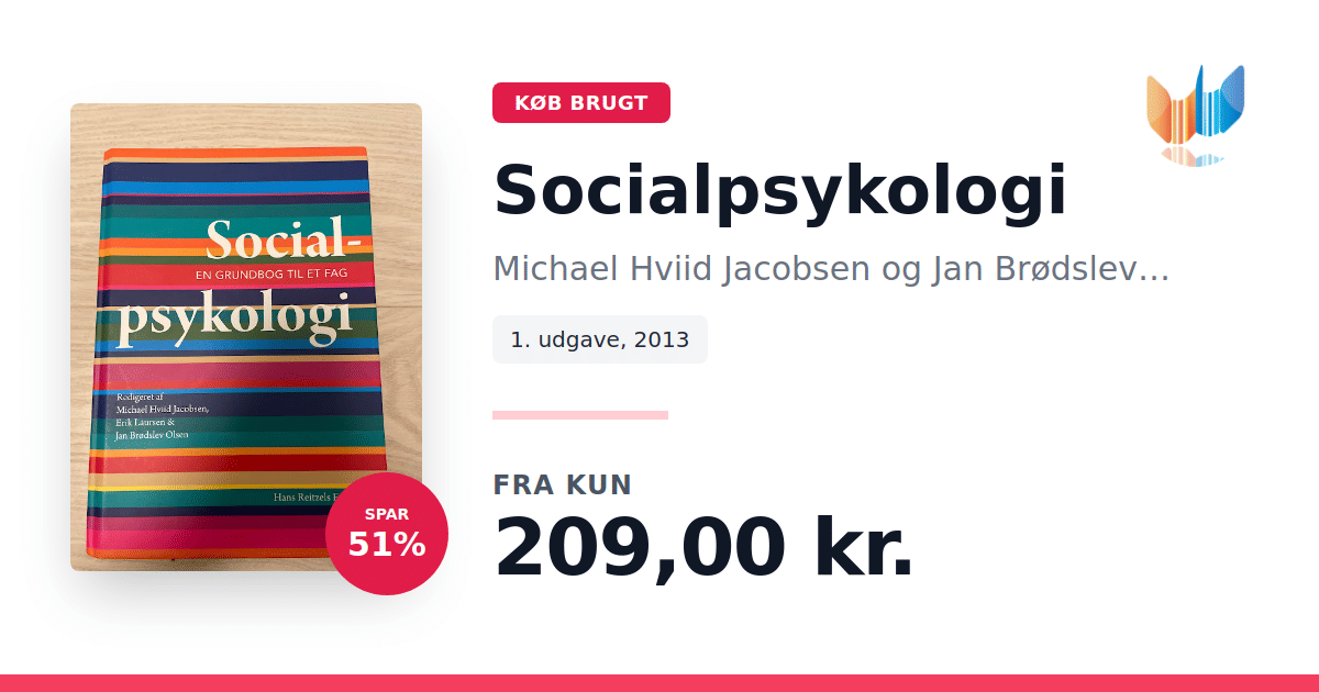 Lige nu kan du købe "Socialpsykologi" af Michael Hviid Jacobsen og Jan Brødslev Olsen til kun 209,00 kr. Du sparer hele 51% af nyprisen! Bogen du ser her er brugt, og i god stand. Vi har i øjeblikket kun et enkelt eksemplar til salg af "Socialpsykologi", så slå til mens du kan!