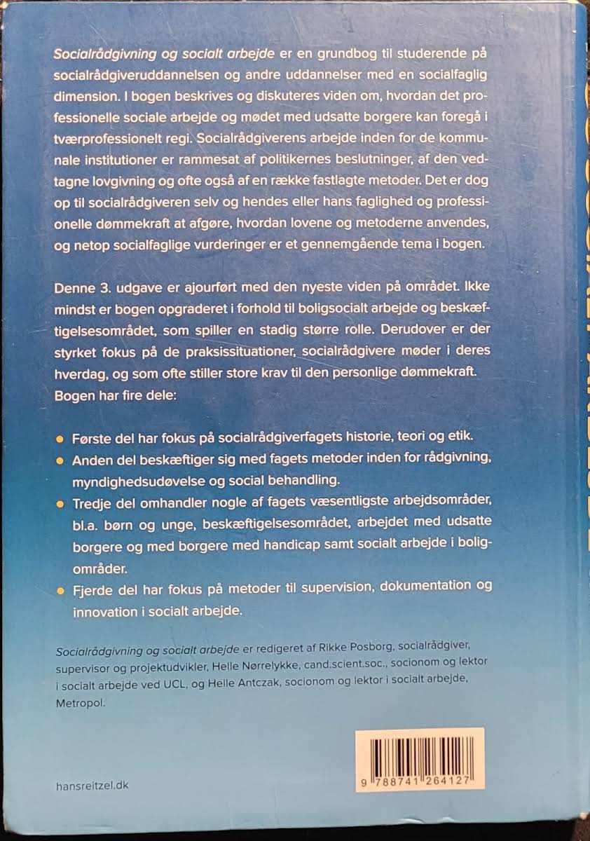Socialrådgivning og socialt arbejde – En grundbog er en central lærebog for studerende inden for socialrådgiveruddannelsen og andre med et socialfagligt fokus. Bogen belyser, hvordan professionelt socialt arbejde kan foregå i et tværfagligt regi, med særlig opmærksomhed på mødet med borgere, der befinder sig i udsatte livssituationer. I denne grundbog introduceres læseren til socialrådgiverfagets teoretiske og etiske fundament samt de metoder, der anvendes i rådgivning, myndighedsudøvelse og social behandling. Selvom de politiske beslutninger, gældende lovgivning og etablerede metoder sætter rammerne for det daglige arbejde, understreges betydningen af den enkelte socialrådgivers faglighed og professionelle dømmekraft. Bogen er struktureret i fire overordnede dele: den første del omhandler fagets historie, teori og etik; den anden fokuserer på de praktiske metoder; den tredje præsenterer centrale arbejdsområder som arbejde med børn og unge, beskæftigelse, støtte til udsatte borgere samt socialt arbejde i boligområder; og den fjerde del giver redskaber til supervision, dokumentation og innovation i praksis. Med indsigtsfulde perspektiver og relevante eksempler fremmer bogen en nuanceret forståelse af det komplekse sociale arbejde.