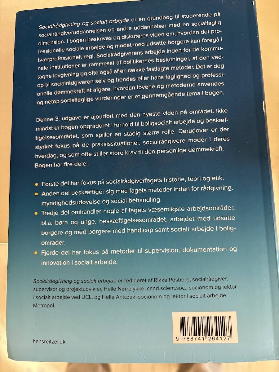 Socialrådgivning og socialt arbejde – En grundbog er en central lærebog for studerende inden for socialrådgiveruddannelsen og andre med et socialfagligt fokus. Bogen belyser, hvordan professionelt socialt arbejde kan foregå i et tværfagligt regi, med særlig opmærksomhed på mødet med borgere, der befinder sig i udsatte livssituationer. I denne grundbog introduceres læseren til socialrådgiverfagets teoretiske og etiske fundament samt de metoder, der anvendes i rådgivning, myndighedsudøvelse og social behandling. Selvom de politiske beslutninger, gældende lovgivning og etablerede metoder sætter rammerne for det daglige arbejde, understreges betydningen af den enkelte socialrådgivers faglighed og professionelle dømmekraft. Bogen er struktureret i fire overordnede dele: den første del omhandler fagets historie, teori og etik; den anden fokuserer på de praktiske metoder; den tredje præsenterer centrale arbejdsområder som arbejde med børn og unge, beskæftigelse, støtte til udsatte borgere samt socialt arbejde i boligområder; og den fjerde del giver redskaber til supervision, dokumentation og innovation i praksis. Med indsigtsfulde perspektiver og relevante eksempler fremmer bogen en nuanceret forståelse af det komplekse sociale arbejde.