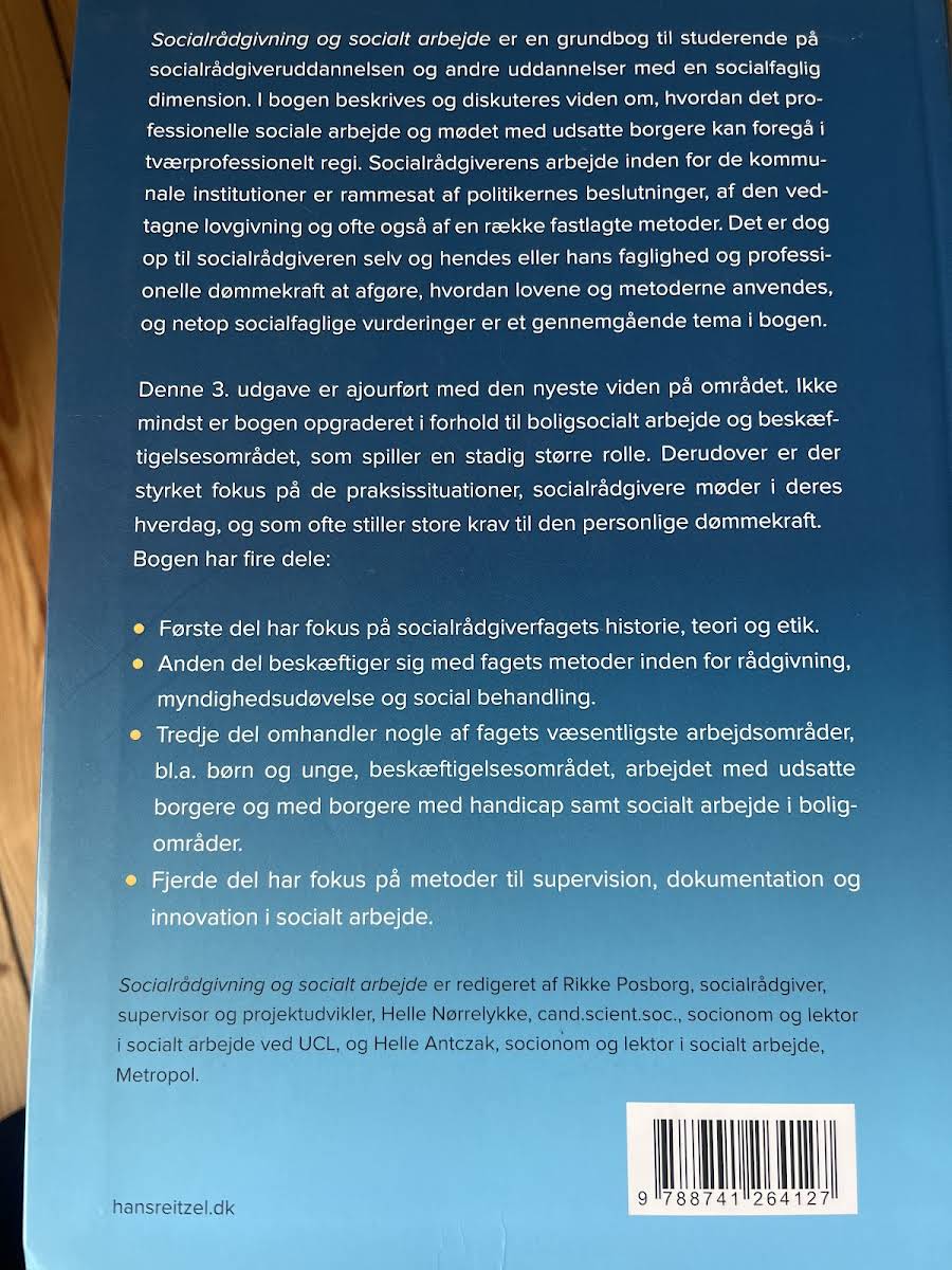 Socialrådgivning og socialt arbejde – En grundbog er en central lærebog for studerende inden for socialrådgiveruddannelsen og andre med et socialfagligt fokus. Bogen belyser, hvordan professionelt socialt arbejde kan foregå i et tværfagligt regi, med særlig opmærksomhed på mødet med borgere, der befinder sig i udsatte livssituationer. I denne grundbog introduceres læseren til socialrådgiverfagets teoretiske og etiske fundament samt de metoder, der anvendes i rådgivning, myndighedsudøvelse og social behandling. Selvom de politiske beslutninger, gældende lovgivning og etablerede metoder sætter rammerne for det daglige arbejde, understreges betydningen af den enkelte socialrådgivers faglighed og professionelle dømmekraft. Bogen er struktureret i fire overordnede dele: den første del omhandler fagets historie, teori og etik; den anden fokuserer på de praktiske metoder; den tredje præsenterer centrale arbejdsområder som arbejde med børn og unge, beskæftigelse, støtte til udsatte borgere samt socialt arbejde i boligområder; og den fjerde del giver redskaber til supervision, dokumentation og innovation i praksis. Med indsigtsfulde perspektiver og relevante eksempler fremmer bogen en nuanceret forståelse af det komplekse sociale arbejde.