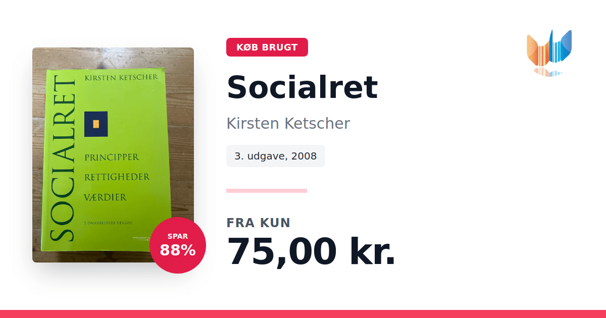 Lige nu kan du købe "Socialret" af Kirsten Ketscher til kun 75,00 kr. Du sparer hele 88% af nyprisen! Bogen du ser her er brugt, og i god stand. Vi har i øjeblikket 4 eksemplarer til salg af "Socialret", så husk at se de forskellige udgaver.