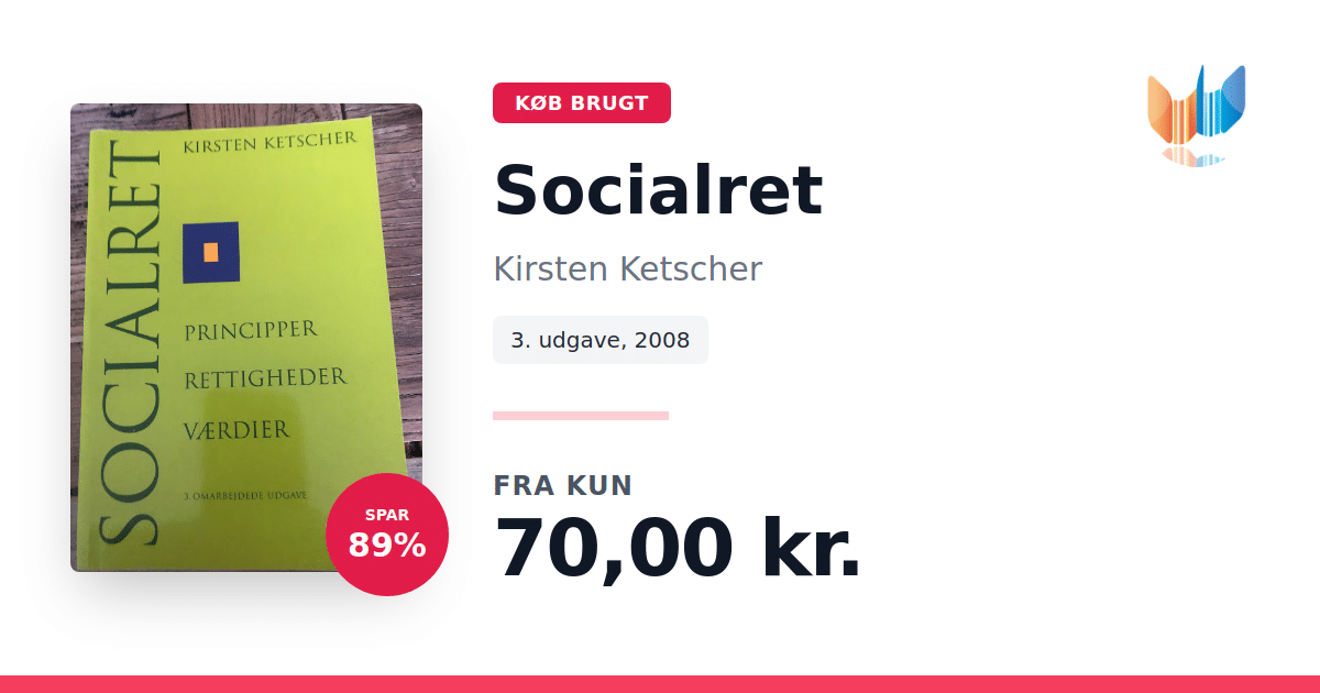 Lige nu kan du købe "Socialret" af Kirsten Ketscher til kun 70,00 kr. Du sparer hele 89% af nyprisen! Bogen du ser her er brugt, og i perfekt stand. Vi har i øjeblikket 4 eksemplarer til salg af "Socialret", så husk at se de forskellige udgaver.