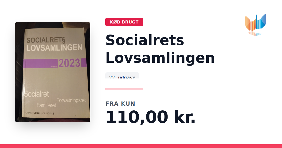 Lige nu kan du købe "Socialrets Lovsamlingen" til kun 110,00 kr. Bogen du ser her er brugt, og i god stand. Vi har i øjeblikket kun et enkelt eksemplar til salg af "Socialrets Lovsamlingen", så slå til mens du kan!