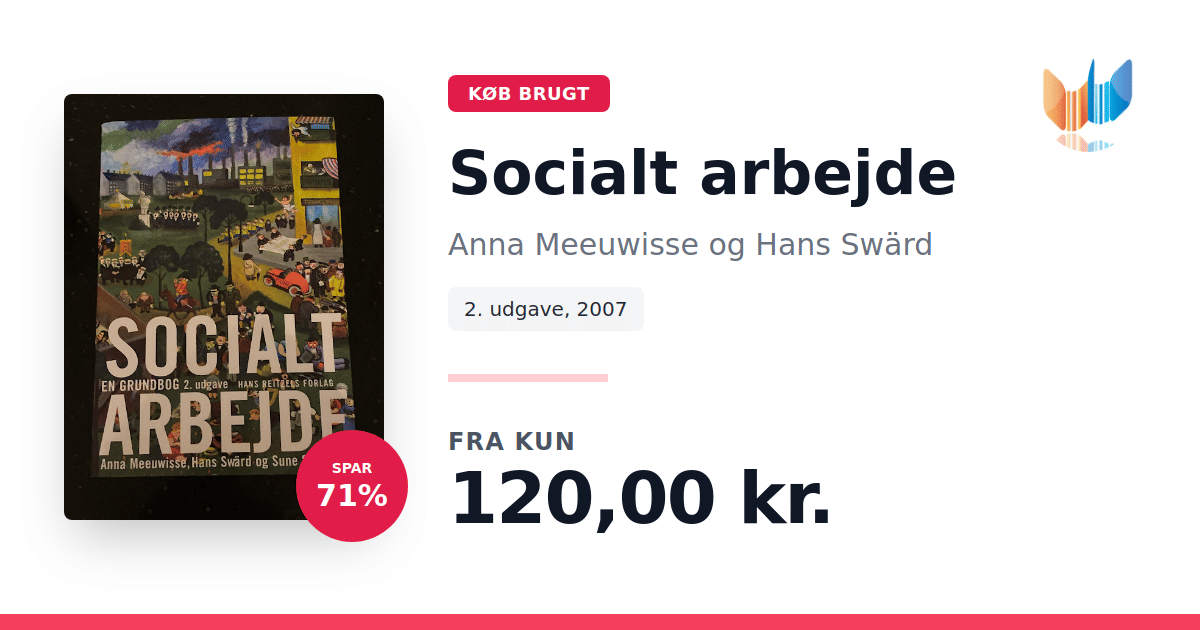 Lige nu kan du købe "Socialt arbejde" af Anna Meeuwisse og Hans Swärd til kun 120,00 kr. Du sparer hele 71% af nyprisen! Bogen du ser her er brugt, og i perfekt stand. Vi har i øjeblikket 2 eksemplarer til salg af "Socialt arbejde", så husk at se de forskellige udgaver.