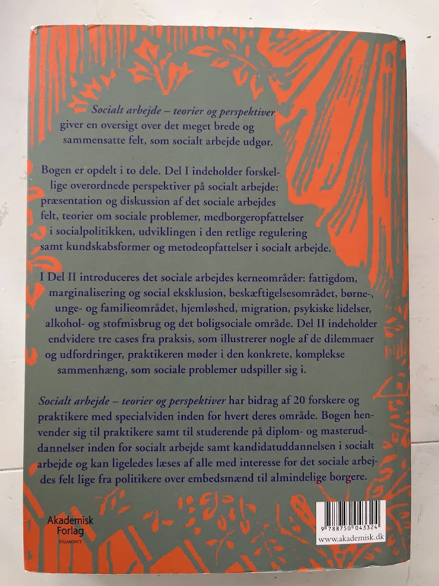 I "Socialt arbejde" tilbydes læseren en grundig introduktion til det omfattende og komplekse felt, som kendetegner netop socialt arbejde. Bogen præsenterer både teoretiske overvejelser og praktiske erfaringer, der tilsammen giver en nuanceret forståelse af, hvordan sociale problemstillinger og interventioner formes i dagens samfund. Teksten er struktureret i to dele, hvor den første del belyser de overordnede teoretiske perspektiver. Her diskuteres centrale emner såsom feltets grundantagelser, udviklingen inden for lovgivning og de metoder, der anvendes i socialt arbejde. Denne del danner fundamentet for at forstå de videre diskussioner i bogen. I den anden del vendes blikket mod praksisnære problemstillinger, hvor temaer som fattigdom, marginalisering og social eksklusion står i fokus. Gennem illustrative cases fra virkeligheden får læseren et indblik i de dilemmaer og udfordringer, som præger det daglige virke. Med sit brede og tværfaglige perspektiv er "Socialt arbejde" et relevant redskab for både studerende og praktikere, der ønsker et dybere indblik i dette vigtige fagområde.