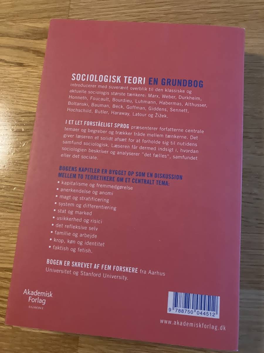 "Sociologisk teori – en grundbog" tilbyder et omfattende indblik i centrale sociologiske teorier og giver læseren de nødvendige redskaber til at forstå både klassiske og nutidige samfundsproblematikker. Gennem et letforståeligt sprog præsenteres de væsentligste temaer i teorier udarbejdet af store tænkere, og de klassiske teoretiske debatpunkter bliver levende gennem kapitler struktureret som diskussioner mellem to perspektiver. Bogen indfanger dynamikken mellem centrale begreber som anerkendelse og anomi, stat og marked, og kaster lys over, hvordan sociologien beskriver og analyserer det sociale samfund. Med klare sammenhænge og tråde mellem teorierne giver "Sociologisk teori – en grundbog" et solidt fundament for at forholde sig teoretisk til moderne problemstillinger. Bogen er forfattet af Carsten Bagge Laustsen, Lars Thorup Larsen, Mads P. Sørensen, Mathias Wullum og Tine Ravn og udkom i 2016 hos Akademisk Forlag.