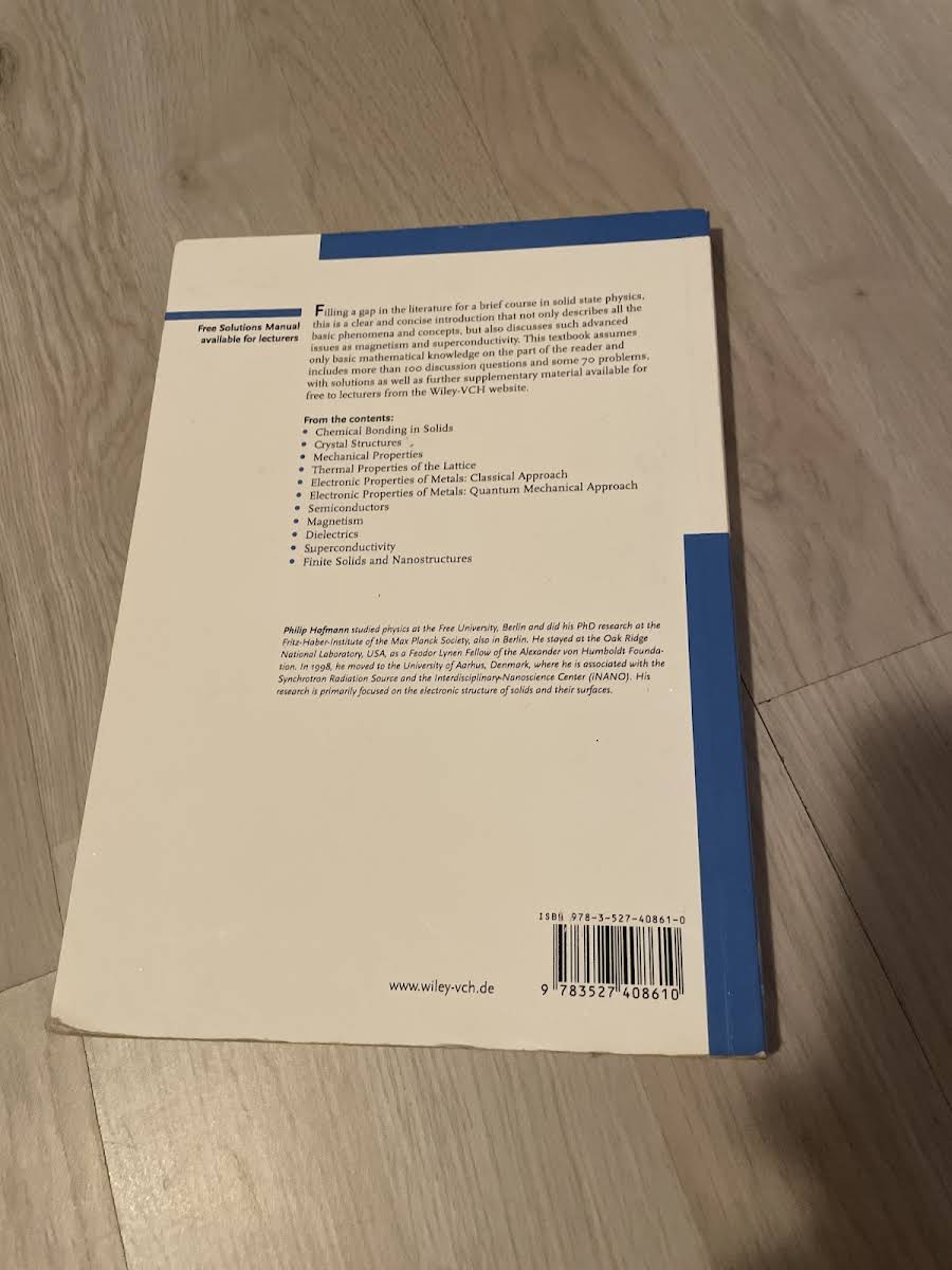 Solid State Physics: An Introduction af Philip Hofmann er en kortfattet og overskuelig indføring i faststoffysikkens verden. Med kun basal matematisk baggrund som forudsætning guider bogen læseren gennem de grundlæggende begreber og fænomener i krystalstruktur og elektronbevægelser. Herefter bevæger den sig videre til mere avancerede emner som magnetisme, ferromagnetisme og superconductivitet, hvor klare forklaringer og illustrative eksempler sikrer en dybdegående forståelse uden at gøre stoffet tungt. På 233 sider formår Hofmann at balancere dybde og tilgængelighed, hvilket gør værket velegnet både som pensum i korte kurser og som opslagsværk for den nysgerrige studerende eller forsker. Udgivet af Wiley-VCH i 2008 i paperback-udgave.