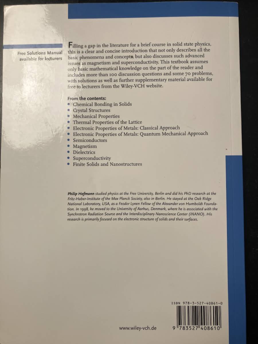 Solid State Physics: An Introduction af Philip Hofmann er en kortfattet og overskuelig indføring i faststoffysikkens verden. Med kun basal matematisk baggrund som forudsætning guider bogen læseren gennem de grundlæggende begreber og fænomener i krystalstruktur og elektronbevægelser. Herefter bevæger den sig videre til mere avancerede emner som magnetisme, ferromagnetisme og superconductivitet, hvor klare forklaringer og illustrative eksempler sikrer en dybdegående forståelse uden at gøre stoffet tungt. På 233 sider formår Hofmann at balancere dybde og tilgængelighed, hvilket gør værket velegnet både som pensum i korte kurser og som opslagsværk for den nysgerrige studerende eller forsker. Udgivet af Wiley-VCH i 2008 i paperback-udgave.