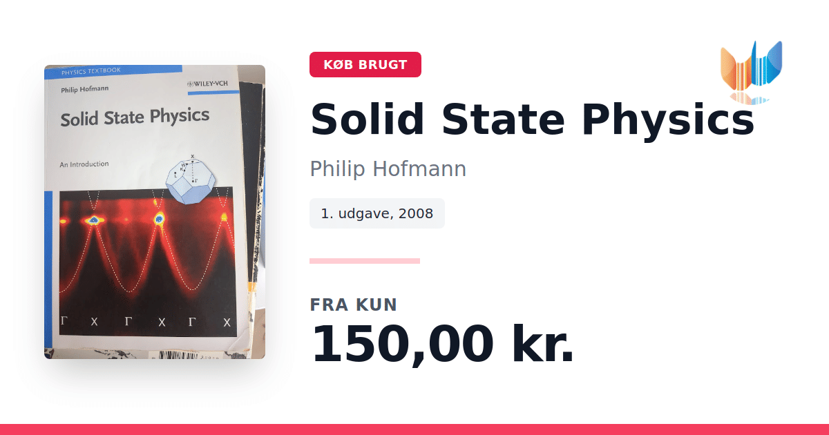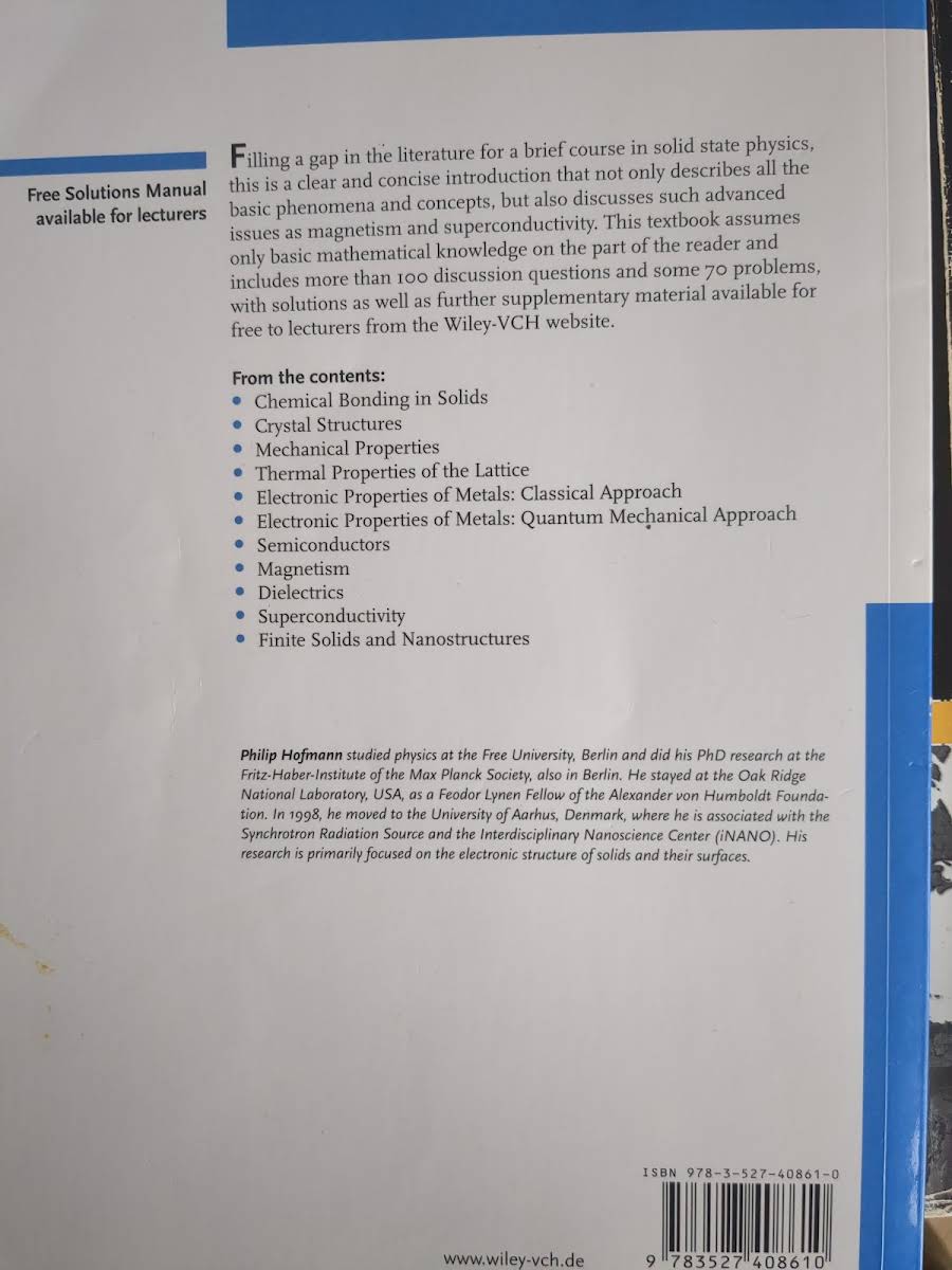 Solid State Physics: An Introduction af Philip Hofmann er en kortfattet og overskuelig indføring i faststoffysikkens verden. Med kun basal matematisk baggrund som forudsætning guider bogen læseren gennem de grundlæggende begreber og fænomener i krystalstruktur og elektronbevægelser. Herefter bevæger den sig videre til mere avancerede emner som magnetisme, ferromagnetisme og superconductivitet, hvor klare forklaringer og illustrative eksempler sikrer en dybdegående forståelse uden at gøre stoffet tungt. På 233 sider formår Hofmann at balancere dybde og tilgængelighed, hvilket gør værket velegnet både som pensum i korte kurser og som opslagsværk for den nysgerrige studerende eller forsker. Udgivet af Wiley-VCH i 2008 i paperback-udgave.