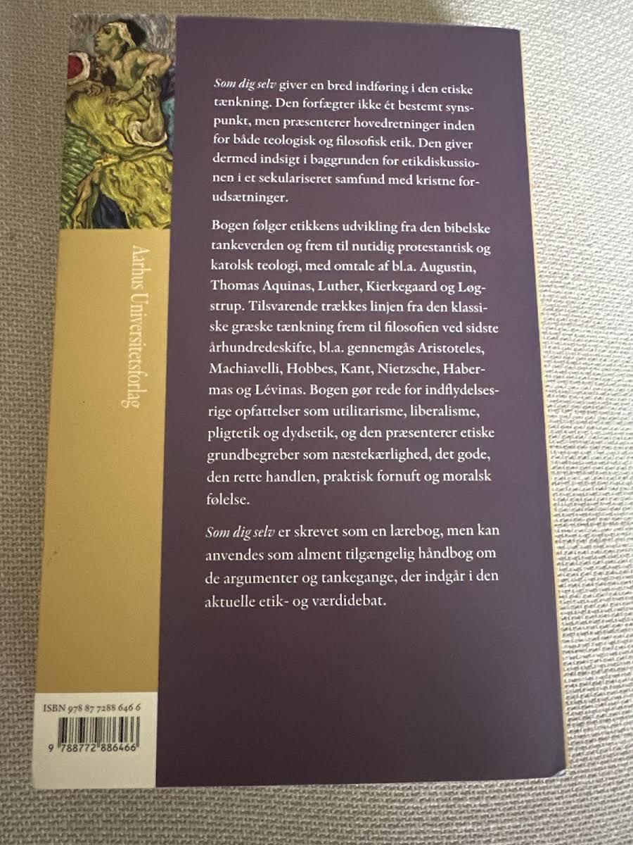 "Som dig selv" er en grundig lærebog og håndbog, der dykker ned i den etiske tankegang og præsenterer de centrale retninger inden for både teologisk og filosofisk etik. Bogen tilbyder et indsigtsfuldt overblik over de argumenter, der former vores etiske debat i et sekulariseret samfund med kristne rødder, og følger etikkens udvikling fra de bibelske visioner til moderne protestantisk og katolsk teologi med omtale af blandt andet Augustin, Thomas Aquinas, Luther, Kierkegaard og Løgstrup. Bogen trækker desuden trådene fra den klassiske græske tænkning helt frem til filosofien ved århundredeskiftet, hvor tænkere som Aristoteles, Machiavelli, Hobbes, Kant, Nietzsche og Habermas belyses. Med sine 380 sider gør "Som dig selv" rede for indflydelsesrige opfattelser som utilitarisme, liberalisme, pligtetik og dydsetik, og den introducerer grundlæggende etiske begreber såsom næstekærlighed, praktisk fornuft og moralsk følelse. Denne bog er et uundværligt redskab for alle, der ønsker en dybere forståelse af de etiske principper, der former vores samfund.