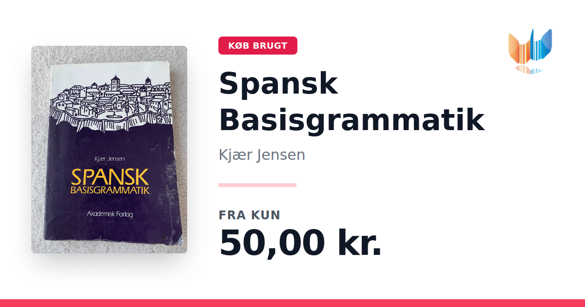 Lige nu kan du købe "Spansk Basisgrammatik" af Kjær Jensen til kun 50,00 kr. Bogen du ser her er brugt, og i god stand. Vi har i øjeblikket kun et enkelt eksemplar til salg af "Spansk Basisgrammatik", så slå til mens du kan!