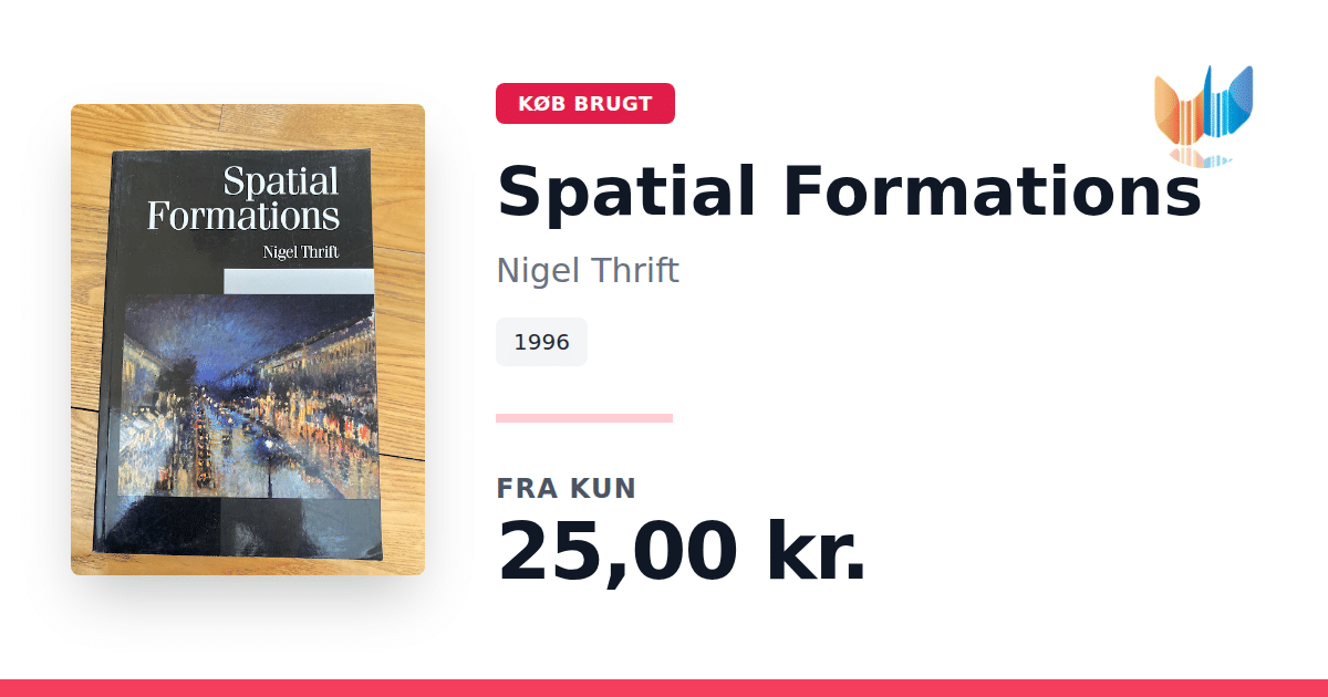 Lige nu kan du købe "Spatial Formations" af Nigel Thrift til kun 25,00 kr. Bogen du ser her er brugt, og i perfekt stand. Vi har i øjeblikket kun et enkelt eksemplar til salg af "Spatial Formations", så slå til mens du kan!