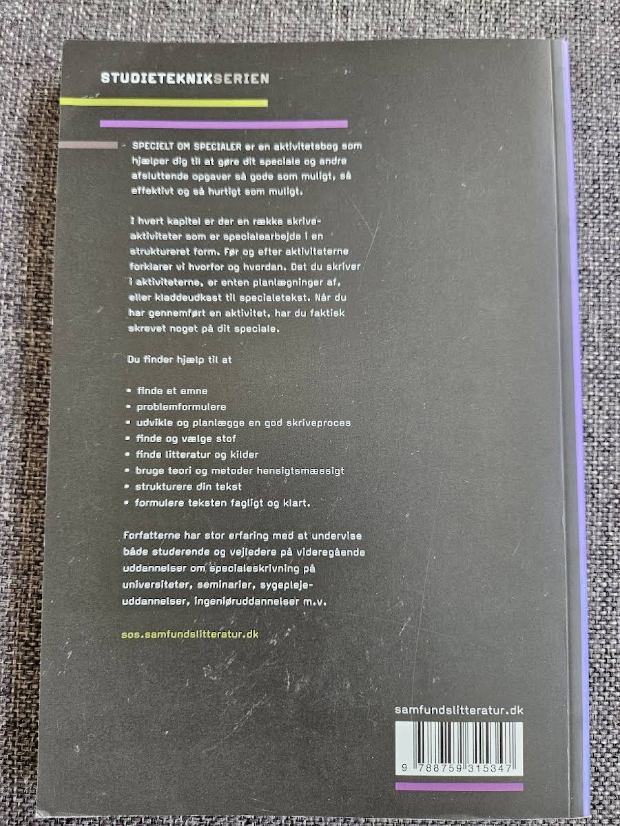 Specielt om specialer er en aktivitetsbog, der er udviklet til studerende, som skal skrive deres afsluttende speciale. Bogen er skabt af Lotte Rienecker, Signe Skov og Peter Stray Jörgensen og bringer et praktisk værktøjssæt til skriveprocessen. Her møder du aktiviteter, der både lægger vægt på læsning, undersøgelser og skrivning, så du kontinuerligt kan omsætte dine ideer til konkrete tekstudkast. I hvert kapitel forklares formålet med både forberedende og efterfølgende øvelser, og du bliver guidet igennem, hvordan du bedst griber processen an. Med en struktureret tilgang til planlægning og skrivning giver bogen dig redskaberne til at imødekomme de krav og forventninger, der stilles til et afsluttende speciale. Specielt om specialer indbyder til en effektiv og målrettet arbejdsproces, hvor hvert skridt bidrager til din samlede specialetekst.
