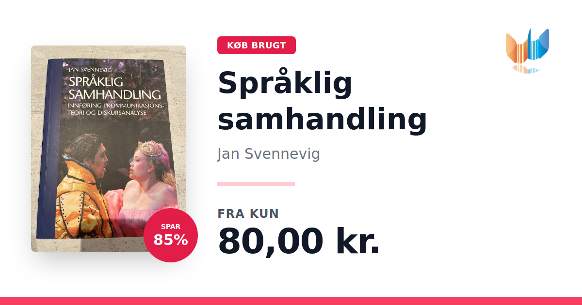 Lige nu kan du købe "Språklig samhandling" af Jan Svennevig til kun 80,00 kr. Du sparer hele 85% af nyprisen! Bogen du ser her er brugt, og i god stand. Vi har i øjeblikket 2 eksemplarer til salg af "Språklig samhandling", så husk at se de forskellige udgaver.