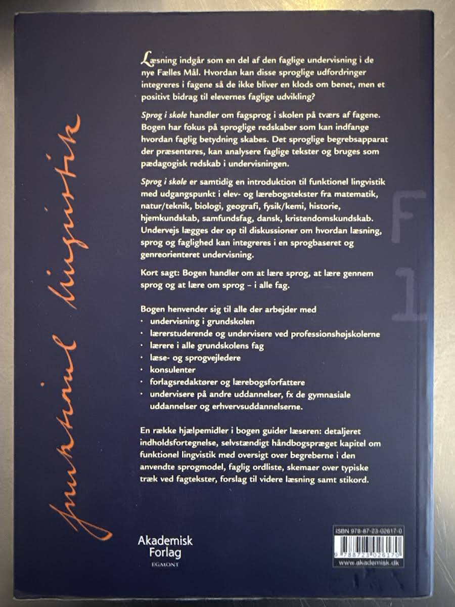 I Sprog i Skole. Læseudviklende undervisning i alle fag. Funktionel lingvistik præsenterer Ruth Mulvad et helhedsorienteret blik på, hvordan sprog og læsning kan blive katalysator for faglig forståelse. Med udgangspunkt i funktionel lingvistik viser bogen, hvordan elever lærer sprog gennem fagligt indhold og samtidig udvikler deres læsefærdigheder. Hverdagens tekster fra matematik, natur/teknik, biologi, geografi, fysik/kemi, historie, hjemkundskab, samfundsfag, dansk og kristendomskundskab danner grundlag for diskussioner om integreret sprog- og fagundervisning. Målet er at vende sproglige barrierer til læringsmuligheder, så læsning styrker både forståelse og engagement. Med konkrete eksempler på tekstanalyse, genrearbejde og sprogbearbejdning giver bogen pædagogiske redskaber til at planlægge undervisning, der sætter sprog i centrum. Sprog i Skole er et uundværligt værktøj for lærere, der ønsker at skabe en læseudviklende praksis i alle fag.