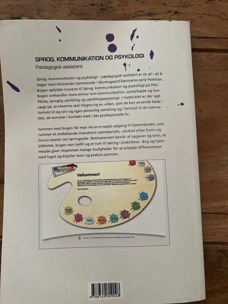 Sprog, kommunikation og psykologi - Pædagogisk assistent (1. udgave, 2010) er én af otte titler i Munksgaards serie Paletten. Bogen er målrettet de faglige krav på Pædagogisk Assistent Uddannelsen og giver et solidt overblik over centrale teorier og praksis. Du møder grundlæggende emner som kommunikation, samarbejde og konflikthåndtering, sproglig udvikling samt udviklingspsykologi. Materialet er tilrettelagt, så du både får indsigt i din egen personlige udvikling og redskaber til at støtte andre i professionelle sammenhænge. Sammen med bogen følger en e-nøgle, som åbner adgang til et interaktivt netmateriale baseret på Dunn og Dunns læringsstile. Her finder du opgaver og tests, et digitalt bibliotek, bogen som lydfil og et virtuelt praksisrum, hvor teori og hverdag flyder sammen. Bog og netmateriale giver lærere og studerende mulighed for differentieret undervisning og understøtter den direkte kobling mellem klasseundervisning og praktisk arbejde.