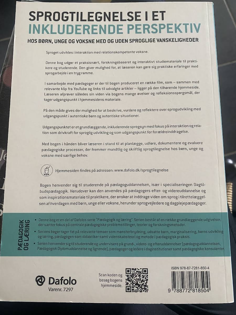 "Sprogtilegnelse i et inkluderende perspektiv - hos børn, unge og voksne med og uden sproglige vanskeligheder" tager afsæt i den grundtanke, at sproget udvikles bedst i tæt interaktion med relationskompetente voksne. Bogen bygger på et inkluderende sprogsyn, hvor gode relationer fungerer som drivkraften for både sproglig udvikling og et styrket forældresamarbejde. Udgivelsen af Helle Iben Bylander og Trine Kjær Krogh fungerer som et praksisnært, forskningsbaseret og interaktivt studiemateriale. Via en tilhørende hjemmeside får læseren adgang til film - udviklet i samarbejde med pædagoger - samt relevante internetartikler og videoklip. Ved at koble dette onlinemateriale med bogens mange øvelser og refleksionsspørgsmål, får man mulighed for at beskrive, analysere og vurdere sprogudvikling i praksis ud fra helt autentiske situationer og børn. Med bogen i hånden bliver læseren i stand til trygt at planlægge, udføre, dokumentere og evaluere pædagogiske processer, der fremmer både den skriftlige og mundtlige sprogtilegnelse. Materialet er primært målrettet studerende på pædagoguddannelsen, særligt inden for faget Dansk, kultur og kommunikation. Derudover er bogen yderst relevant som efteruddannelse og inspirationskilde for praktikere, herunder sprogvejledere og dagplejepædagoger, der ønsker at integrere viden om sprog i hverdagen med børn, unge eller voksne.