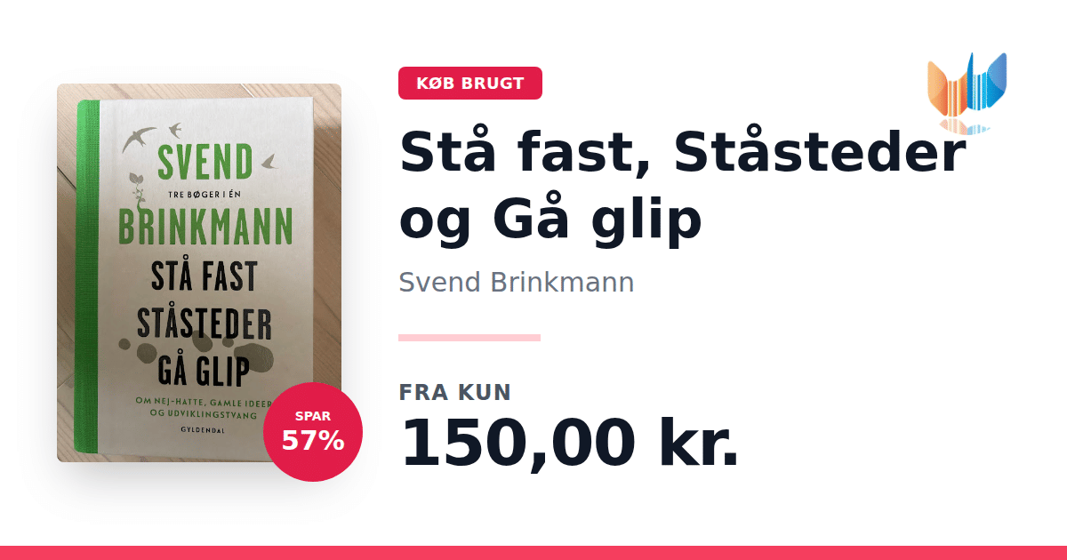 Lige nu kan du købe "Stå fast, Ståsteder og Gå glip" af Svend Brinkmann til kun 150,00 kr. Du sparer hele 57% af nyprisen! Bogen du ser her er brugt, og i perfekt stand. Vi har i øjeblikket kun et enkelt eksemplar til salg af "Stå fast, Ståsteder og Gå glip", så slå til mens du kan!