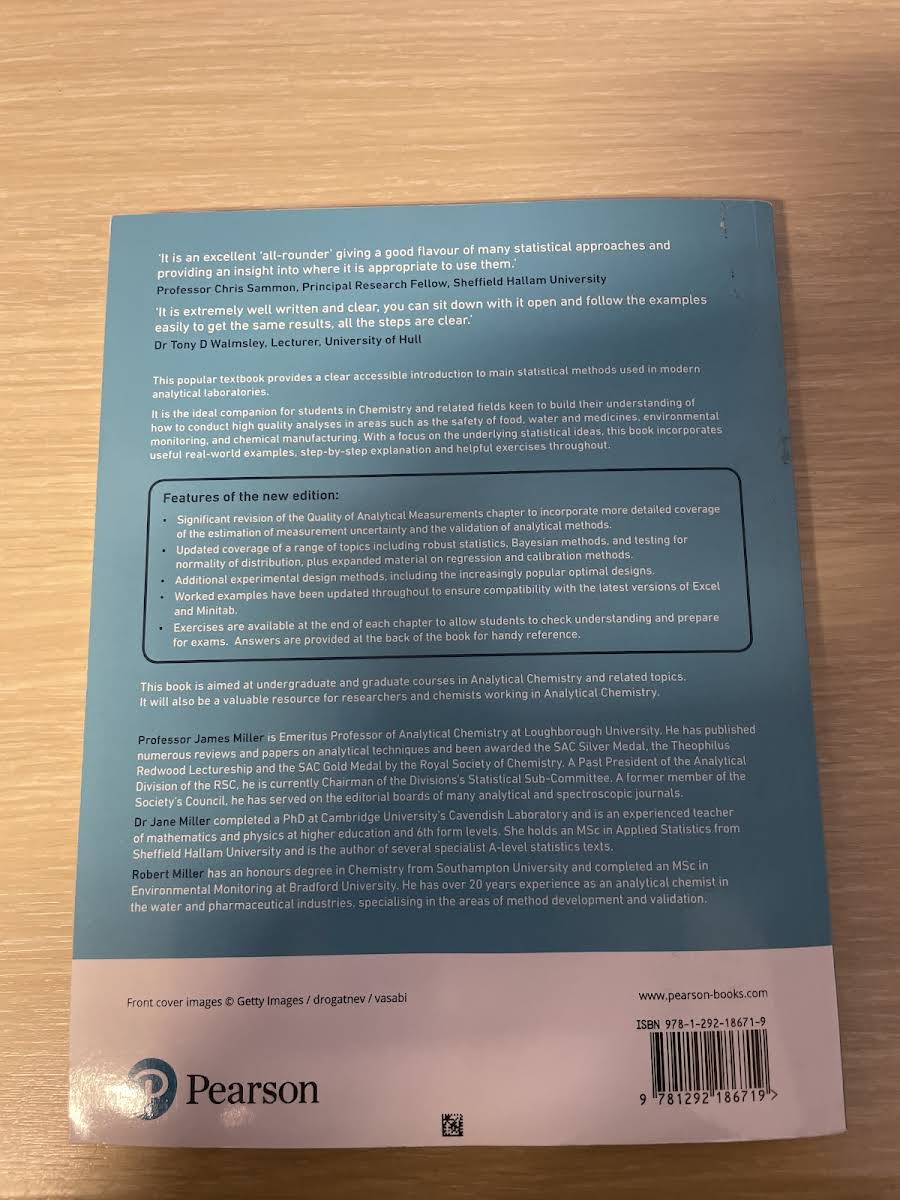 Statistics and Chemometrics for Analytical Chemistry, 7. udgave (2018), giver en klar og tilgængelig introduktion til de centrale statistiske metoder, som anvendes i moderne analytiske laboratorier. Bogen er skrevet af James Miller og Jane C. Miller og udgivet af Pearson Education Limited. Den er fortsat den ideelle følgesvend for studerende i kemi og beslægtede fag, der ønsker at mestre højkvalitetsanalyser inden for fødevaresikkerhed, vand- og medicinovervågning, miljøkontrol samt kemisk produktion. Med fokus på de underliggende statistiske principper præsenteres virkelighedsnære eksempler, trin-for-trin forklaringer og nyttige øvelser gennem hele teksten. Nyheder i denne udgave: · Omfattende revision af kapitlet om kvalitet af analytiske målinger med udvidet behandling af estimering af måleusikkerhed og validering af analysemålemetoder · Opdateret indhold om robuste statistiske metoder, bayesianske tilgange, normalitetstest samt udvidet behandling af regression og kalibrering · Yderligere metoder til eksperimentelt design, herunder de mere og mere populære optimale designs · Opdaterede regneeksempler, der er kompatible med de nyeste versioner af Excel og Minitab · Øvelser i slutningen af hvert kapitel med facitliste bag i bogen Bogen henvender sig til både bachelor- og kandidatstudier i analytisk kemi og relaterede discipliner og vil også være en uvurderlig ressource for forskere og kemikere, der arbejder med analytisk kemi.