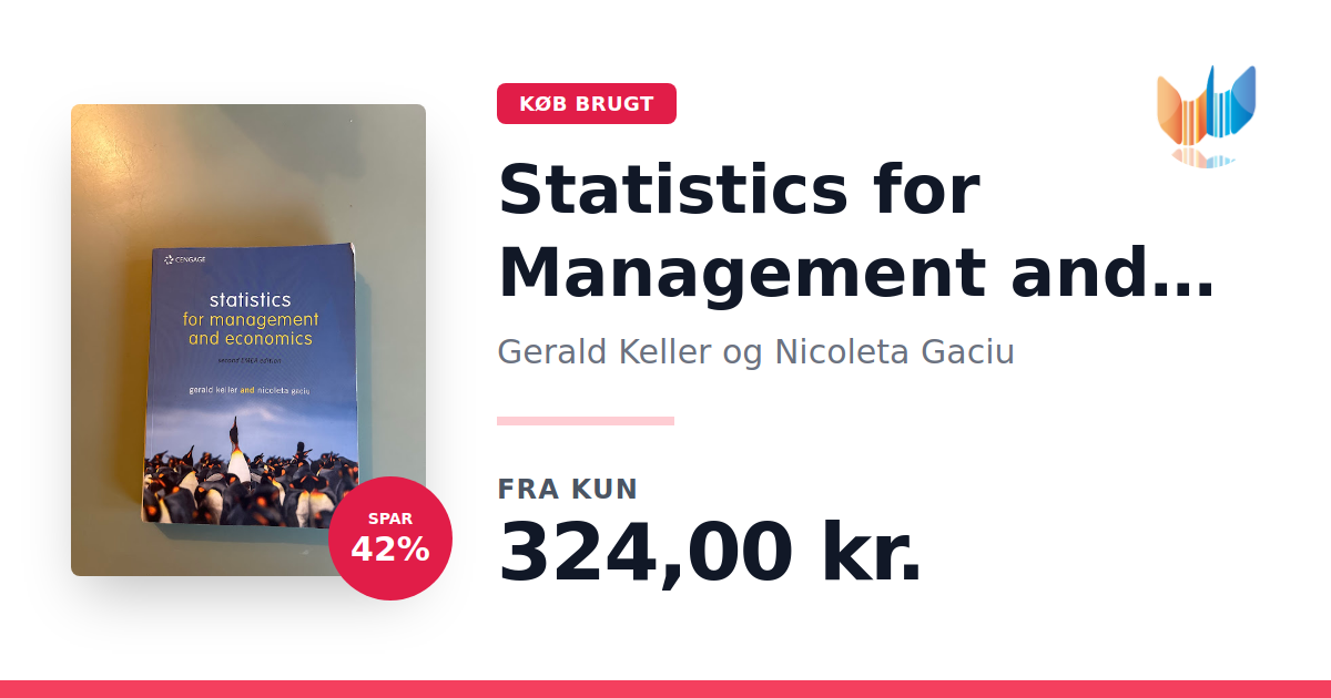Lige nu kan du købe "Statistics for Management and Economics" af Gerald Keller og Nicoleta Gaciu til kun 324,00 kr. Du sparer hele 42% af nyprisen! Bogen du ser her er brugt, og i perfekt stand. Vi har i øjeblikket 5 eksemplarer til salg af "Statistics for Management and Economics", så husk at se de forskellige udgaver.