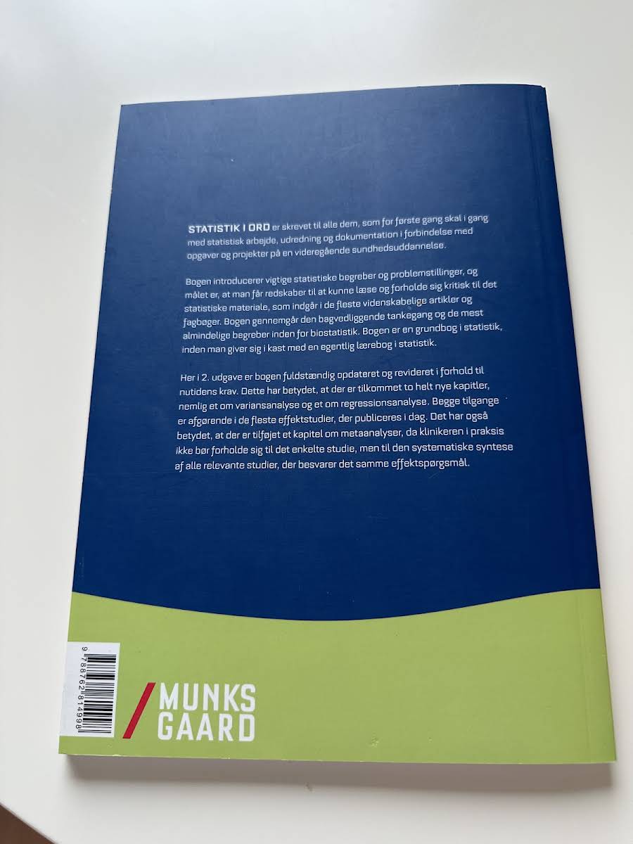 "Statistik i ord" er en klar og præcis introduktion til de grundlæggende statistiske begreber og problemstillinger, der spiller en central rolle i moderne videnskabelig kommunikation. Bogen udstyrer den studerende med værktøjer til at læse og vurdere statistisk materiale kritisk, og den forklarer på en lettilgængelig måde den bagvedliggende tankegang, der er nødvendig for at forstå biostatistik. Med sit simple sprog og velvalgte eksempler er "Statistik i ord" et oplagt udgangspunkt for alle, der for første gang skal beskæftige sig med statistisk udredning og dokumentation – særligt inden for sundhedsuddannelser. Bogen tilrettelægger en læringsrejse, hvor de mest essentielle statistiske metoder og overvejelser bliver bragt i spil, så læseren på en systematisk måde kan tilegne sig et solidt fundament til videre studier og praksis.