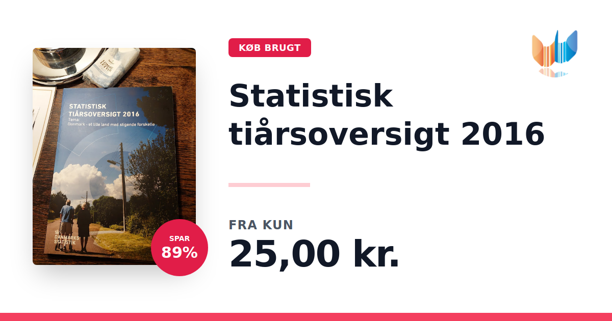 Lige nu kan du købe "Statistisk tiårsoversigt 2016" til kun 25,00 kr. Du sparer hele 89% af nyprisen! Bogen du ser her er brugt, og i god stand. Vi har i øjeblikket kun et enkelt eksemplar til salg af "Statistisk tiårsoversigt 2016", så slå til mens du kan!