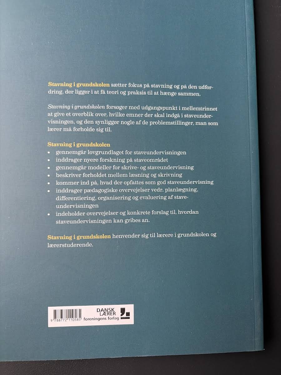 "Stavning i grundskolen" er en grundig introduktion til, hvordan teori og praksis kan forenes i forbindelse med staveundervisningen. Bogen retter sit særlige blik mod mellemtrinnet og præsenterer et klart overblik over de emner og problemstillinger, som lærere og lærerstuderende bør have in mente. Med inddragelse af nyere forskning på området gennemgår forfatteren modeller for skrive- og staveundervisning, og belyser det tætte forhold mellem læsning og skrivning. Bogen indeholder desuden pædagogiske overvejelser samt konkrete forslag til planlægning, differentiering og evaluering af staveundervisningen, som skal understøtte god praksis i grundskolen.
