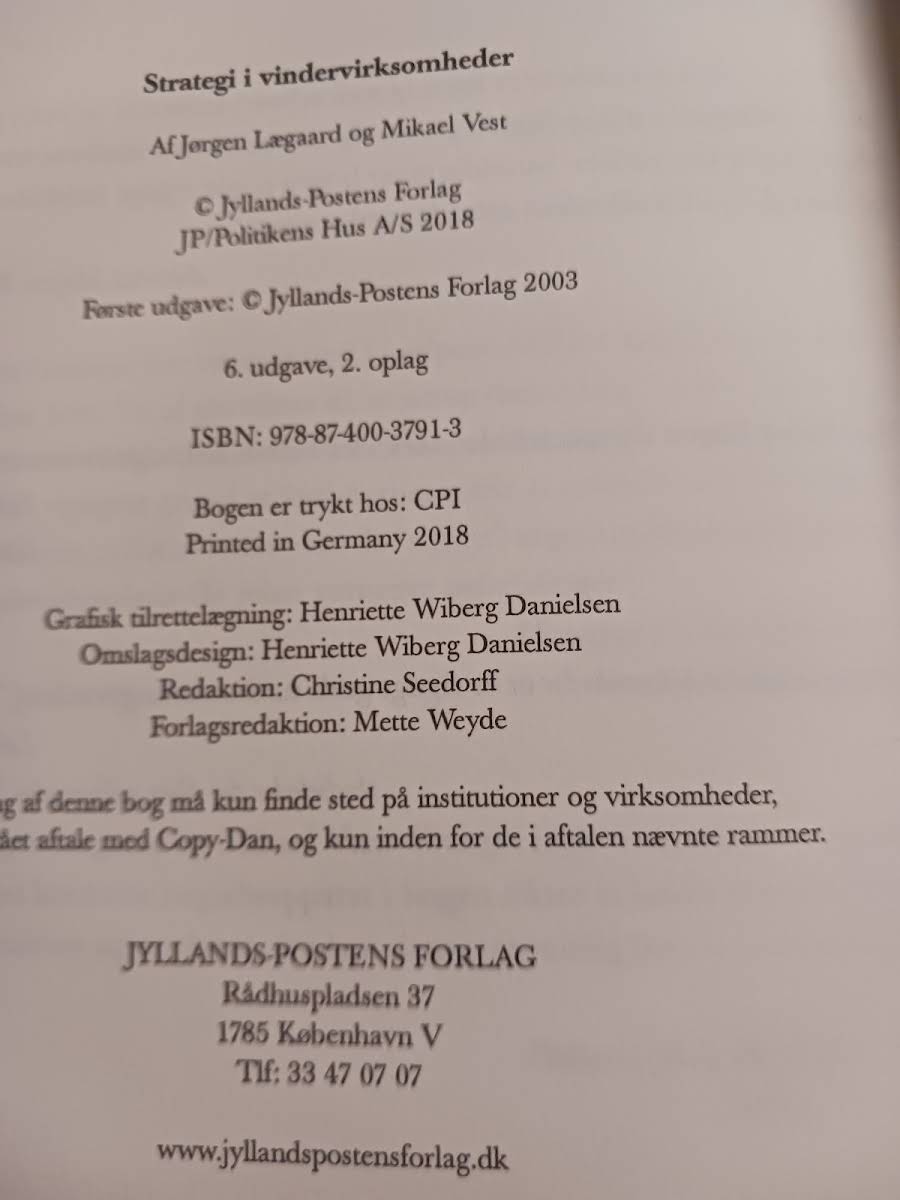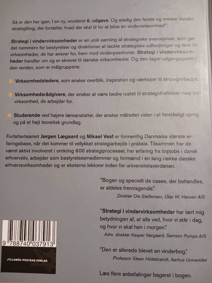 "Strategi i vindervirksomheder" udkommer i en revideret 6. udgave og tilbyder et unikt indblik i, hvordan virksomheder kan opnå en vedvarende vinderposition. Forfatterne Jørgen Lægaard og Mikael Vest trækker på deres imponerende erfaring fra over 600 strategiprocesser, topstillinger i erhvervslivet og undervisning på universiteter, hvilket sikrer en praksisnær og inspirerende tilgang til strategiarbejdet. Denne bog er designet til virksomhedsledere, rådgivere og studerende, der ønsker et overblik og konkrete redskaber til at tackle strategiske udfordringer. Med et letforståeligt sprog kombinerer "Strategi i vindervirksomheder" teoretisk indsigt med virkelighedsnære cases, der hjælper med at omsætte strategi til handling. En solid ressource for alle, der stræber efter at føre deres organisationer mod succes.