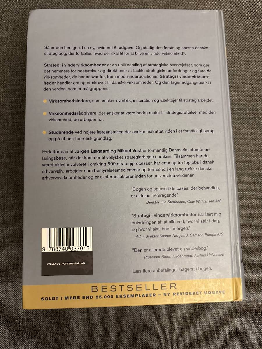 "Strategi i vindervirksomheder" udkommer i en revideret 6. udgave og tilbyder et unikt indblik i, hvordan virksomheder kan opnå en vedvarende vinderposition. Forfatterne Jørgen Lægaard og Mikael Vest trækker på deres imponerende erfaring fra over 600 strategiprocesser, topstillinger i erhvervslivet og undervisning på universiteter, hvilket sikrer en praksisnær og inspirerende tilgang til strategiarbejdet. Denne bog er designet til virksomhedsledere, rådgivere og studerende, der ønsker et overblik og konkrete redskaber til at tackle strategiske udfordringer. Med et letforståeligt sprog kombinerer "Strategi i vindervirksomheder" teoretisk indsigt med virkelighedsnære cases, der hjælper med at omsætte strategi til handling. En solid ressource for alle, der stræber efter at føre deres organisationer mod succes.