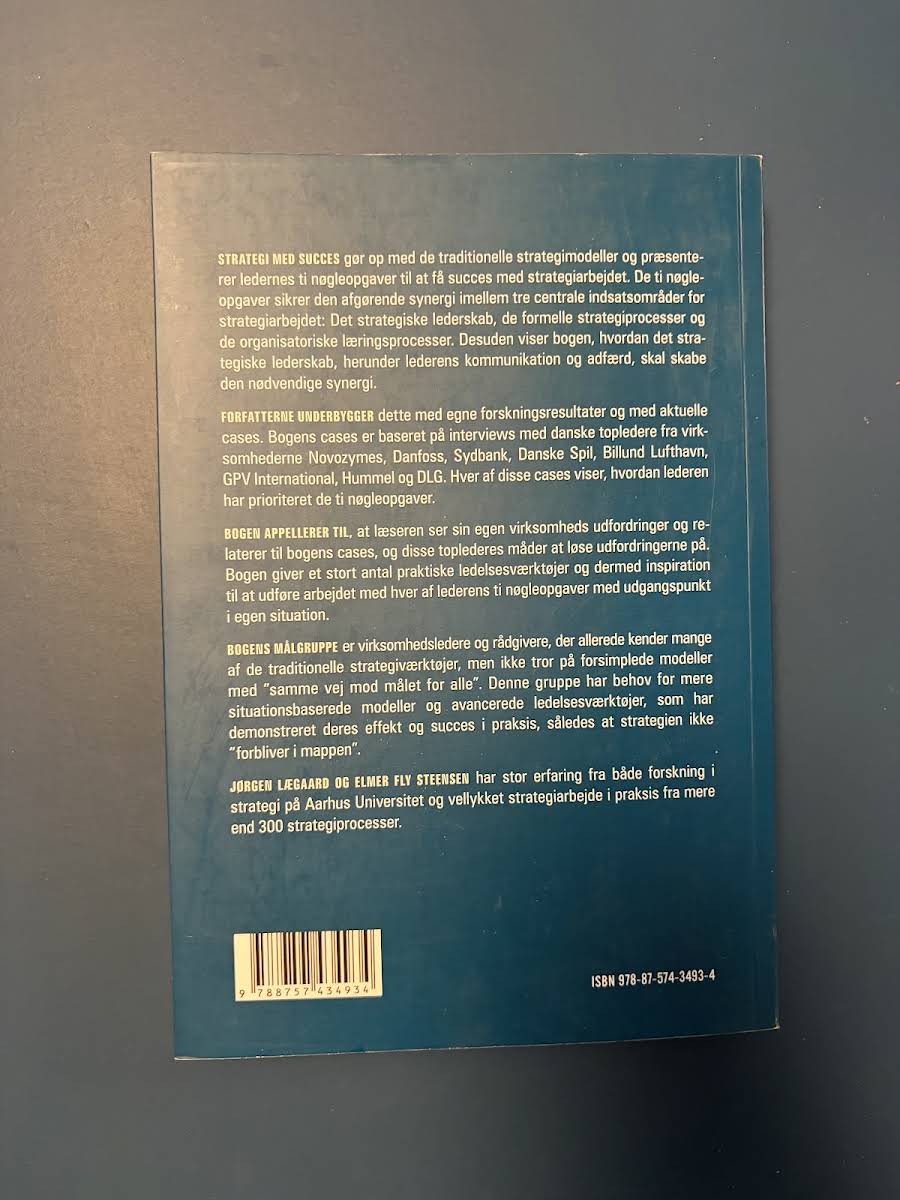 "Strategi med succes" præsenterer en innovativ tilgang til, hvordan de ti nøgleopgaver danner fundamentet for en effektiv strategisk indsats. Forfatterne Jørgen Lægaard og Elmer Fly Steensen demonstrerer, hvordan en vellykket strategi opnås gennem en synergisk kombination af tre centrale indsatsområder, hvor ledelsens kommunikation og personlige adfærd spiller en afgørende rolle. Med udgangspunkt i omfattende forskning og cases med førende danske topledere, illustrerer bogen, hvordan traditionelle strategiværktøjer kan suppleres med nye perspektiver. Læseren opfordres til at relatere de præsenterede metoder til egne organisatoriske udfordringer og til at identificere, hvordan de ti nøgleopgaver konkret kan omsættes til praktiske tiltag. Bogen henvender sig til virksomhedsledere og rådgivere, som allerede er fortrolige med de gængse strategimodeller, men som søger en dybere forståelse af, hvordan kombinationen af formelle strategiprocesser og organisatorisk læring kan skabe vedvarende succes. "Strategi med succes" er en uundværlig guide til at navigere i komplekse forretningsmiljøer og opnå en mere integreret tilgang til strategisk ledelse.