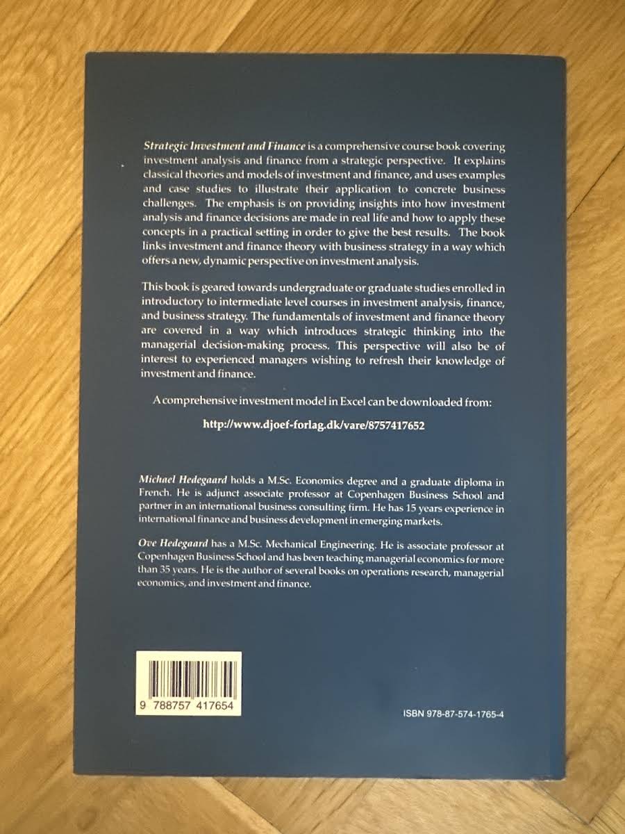 Strategic Investment and Finance af Ove Hedegaard og Michael Hedegaard er en omfattende lærebog, der behandler investeringsanalyse og finansiering med fokus på strategisk sammenhæng. Den kombinerer grundlæggende investeringsteori med virksomhedens overordnede strategi og præsenterer en ny, dynamisk tilgang til ledelsens beslutningsprocesser. Gennemgangen af centrale principper inden for investering og finansiering understøtter strategisk tænkning i alle faser af projektvurderingen. Bogen indeholder desuden henvisning til et detaljeret, downloadbart investeringsmodel, som komplementerer teorien med praktiske redskaber til analyse og beslutning. Strategic Investment and Finance er udgivet af Djoef Publishing i 2008.