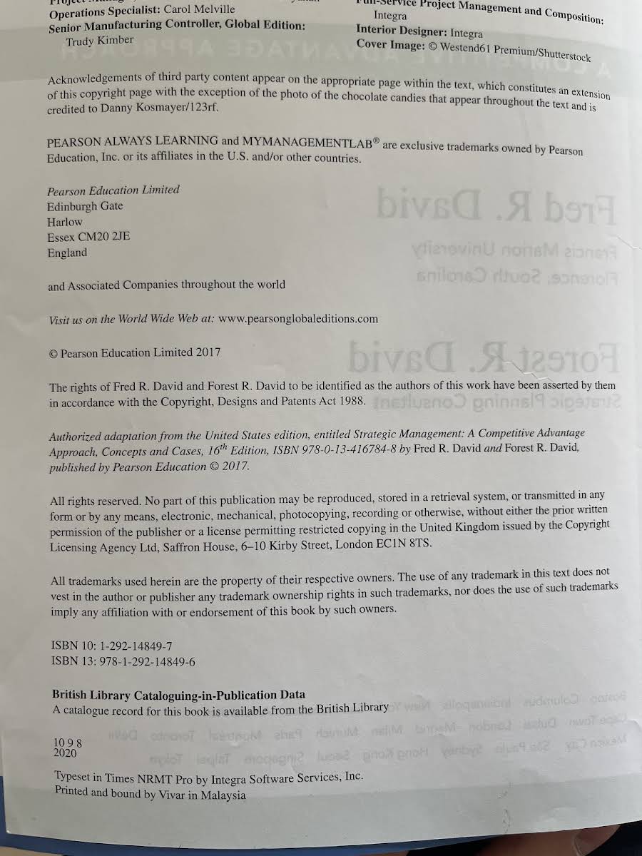 For kurser i strategi. En praktisk og kompetenceorienteret tilgang til strategisk ledelse I en stadig mere kompleks og globaliseret økonomi er det sværere end nogensinde at opnå og fastholde en konkurrencemæssig fordel. Strategic Management: A Competitive Advantage Approach, Concepts and Cases giver en klar og systematisk gennemgang af centrale strategiske begreber og metoder, så studerende kan udvikle og implementere effektive strategier. 16. udgave er gennemrevideret med den nyeste forskning og opdaterede teorier. Bogen indeholder 30 nye cases og rigt end-of-chapter-materiale med supplerende øvelser og repetitionsspørgsmål, der styrker de studerendes analytiske evner og praktiske færdigheder. Fred David og Forest David leverer en grundig og aktuel lærebog, der både dækker klassiske strategiske emner og adresserer de udfordringer, virksomheder møder i den globale kontekst. Med 688 sider er dette omfattende værk en uundværlig ressource for alle, der ønsker at mestre strategisk ledelse.
