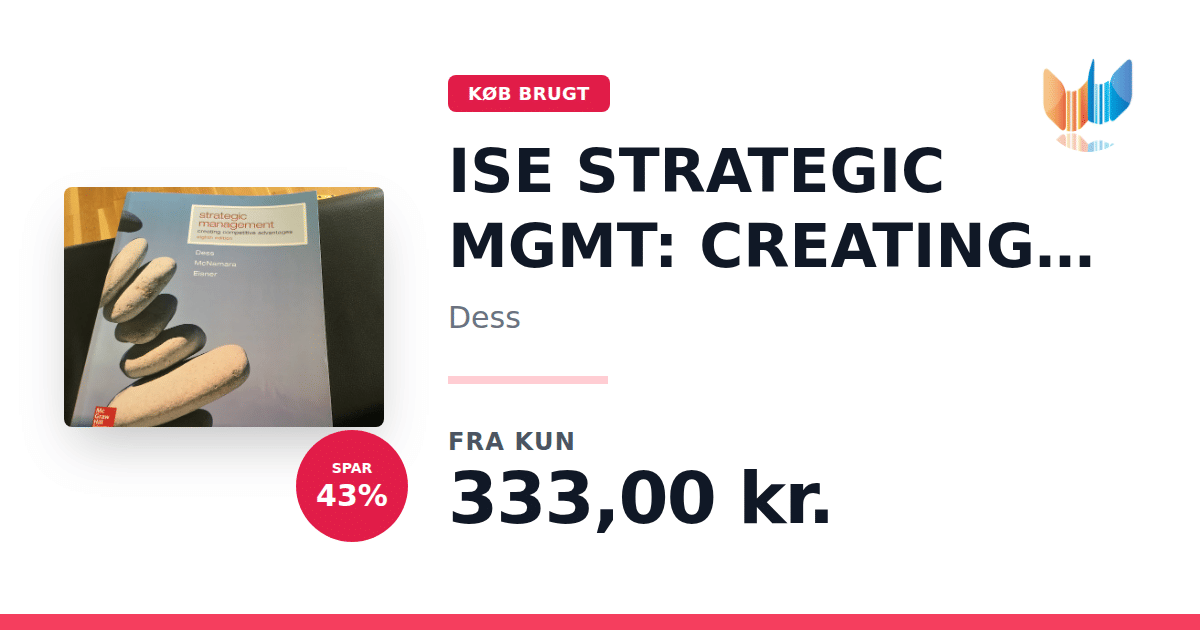 Lige nu kan du købe "ISE STRATEGIC MGMT: CREATING COMPETITIVE ADVANTAGES" af Dess til kun 333,00 kr. Du sparer hele 43% af nyprisen! Bogen du ser her er brugt, og i perfekt stand. Vi har i øjeblikket 2 eksemplarer til salg af "ISE STRATEGIC MGMT: CREATING COMPETITIVE ADVANTAGES", så husk at se de forskellige udgaver.