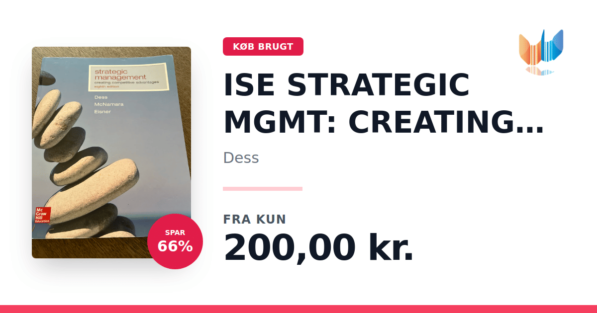 Lige nu kan du købe "ISE STRATEGIC MGMT: CREATING COMPETITIVE ADVANTAGES" af Dess til kun 200,00 kr. Du sparer hele 66% af nyprisen! Bogen du ser her er brugt, og i god stand. Vi har i øjeblikket 2 eksemplarer til salg af "ISE STRATEGIC MGMT: CREATING COMPETITIVE ADVANTAGES", så husk at se de forskellige udgaver.