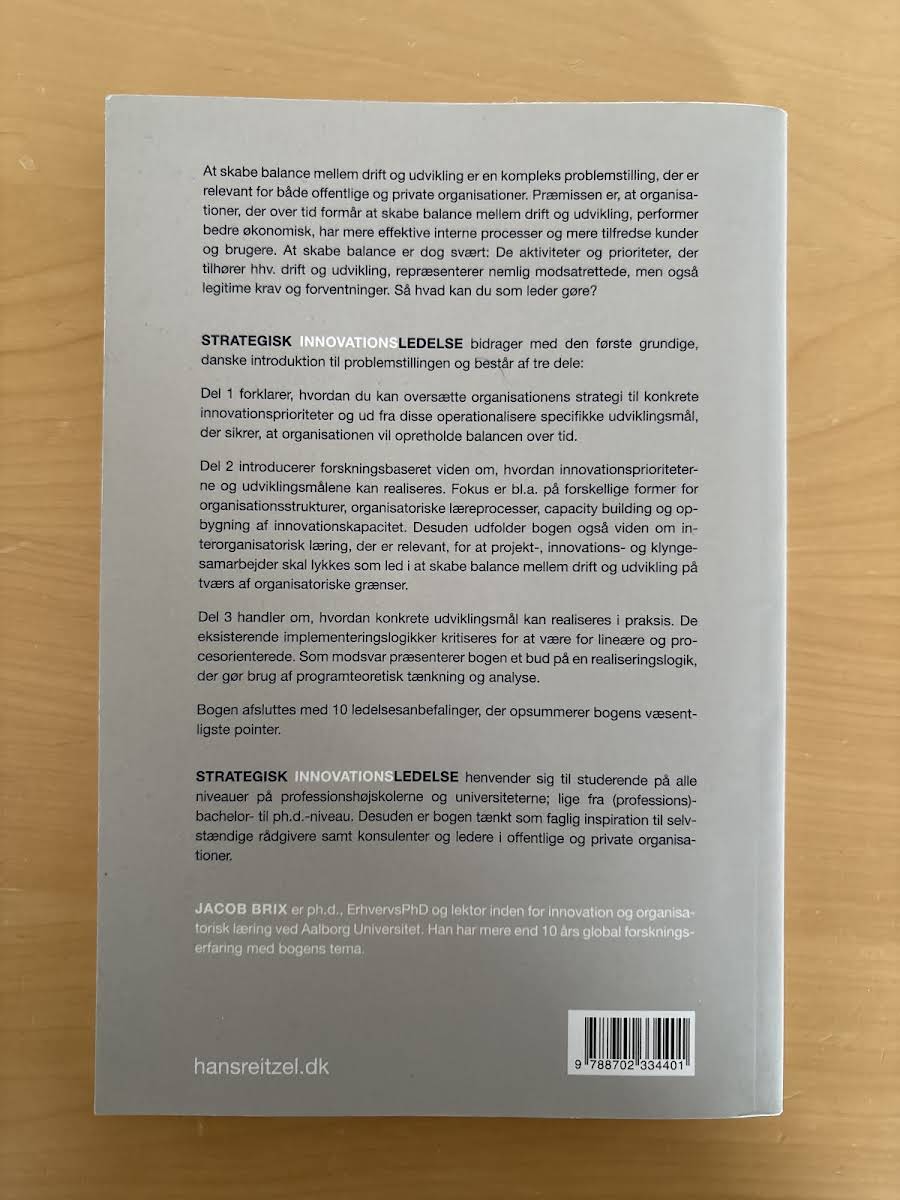 Strategisk innovationsledelse - Om balancen mellem drift og udvikling i offentlige og private organisationer giver den første omfattende danske indføring i, hvordan ledere kan sikre, at daglig drift går hånd i hånd med vedvarende udvikling. Bogen udfolder en helhedsorienteret ramme, som hjælper organisationer med at navigere mellem stabilisering og nytænkning. I bogens første del lærer du at omsætte organisationens overordnede strategi til klare innovationsprioriteter og konkretisere udviklingsmål, der fastholder balancen mellem drift og forandring. Anden del præsenterer forskning, der viser, hvordan disse prioriteringer og mål kan realiseres effektivt. Tredje del retter fokus mod praktisk implementering og illustrerer, hvordan organisationer kan bringe udviklingsmål ud i livet. Bogen afrundes med 10 ledelsesanbefalinger, der samler bogens vigtigste pointer og giver et håndgribeligt kompas for videre arbejde med innovationsledelse. Strategisk innovationsledelse henvender sig til studerende på alle niveauer - fra professionsbachelor til ph.d. - og tilbyder samtidig faglig inspiration til rådgivere, konsulenter og ledere i både offentlige og private organisationer. Jacob Brix er ph.d. og ErhvervsPhD samt lektor i innovation og organisatorisk læring ved Aalborg Universitet. Med over ti års international forskningserfaring inden for innovationsledelse giver han i denne bog et solidt videnskabeligt fundament kombineret med praktisk indsigt.