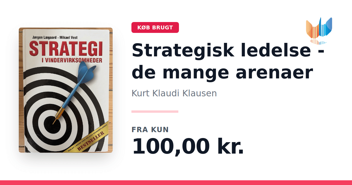 Lige nu kan du købe "Strategisk ledelse - de mange arenaer" af Kurt Klaudi Klausen til kun 100,00 kr. Bogen du ser her er brugt, og i perfekt stand. Vi har i øjeblikket 6 eksemplarer til salg af "Strategi i vindervirksomheder", så husk at se de forskellige udgaver.
