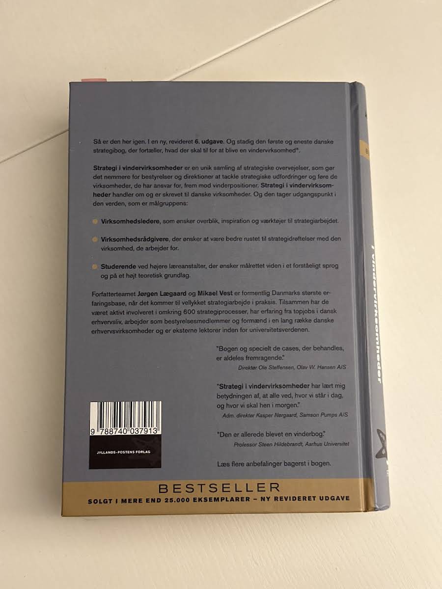 "Strategi i vindervirksomheder" udkommer i en revideret 6. udgave og tilbyder et unikt indblik i, hvordan virksomheder kan opnå en vedvarende vinderposition. Forfatterne Jørgen Lægaard og Mikael Vest trækker på deres imponerende erfaring fra over 600 strategiprocesser, topstillinger i erhvervslivet og undervisning på universiteter, hvilket sikrer en praksisnær og inspirerende tilgang til strategiarbejdet. Denne bog er designet til virksomhedsledere, rådgivere og studerende, der ønsker et overblik og konkrete redskaber til at tackle strategiske udfordringer. Med et letforståeligt sprog kombinerer "Strategi i vindervirksomheder" teoretisk indsigt med virkelighedsnære cases, der hjælper med at omsætte strategi til handling. En solid ressource for alle, der stræber efter at føre deres organisationer mod succes.