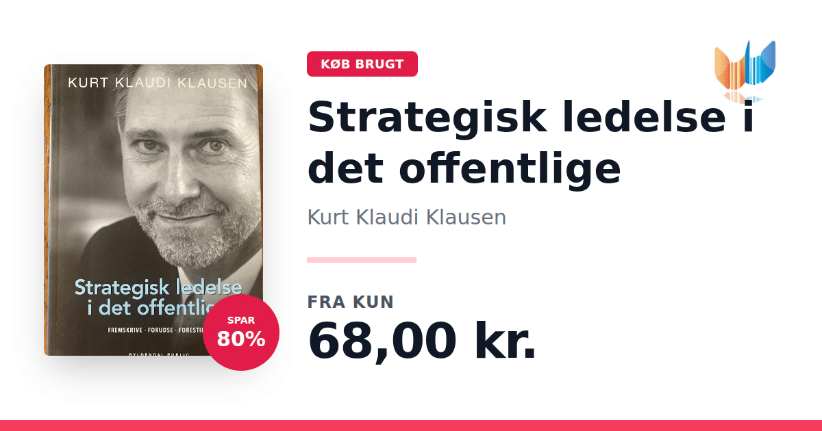 Lige nu kan du købe "Strategisk ledelse i det offentlige" af Kurt Klaudi Klausen til kun 68,00 kr. Du sparer hele 80% af nyprisen! Bogen du ser her er brugt, og i god stand. Vi har i øjeblikket 3 eksemplarer til salg af "Strategisk ledelse i det offentlige", så husk at se de forskellige udgaver.