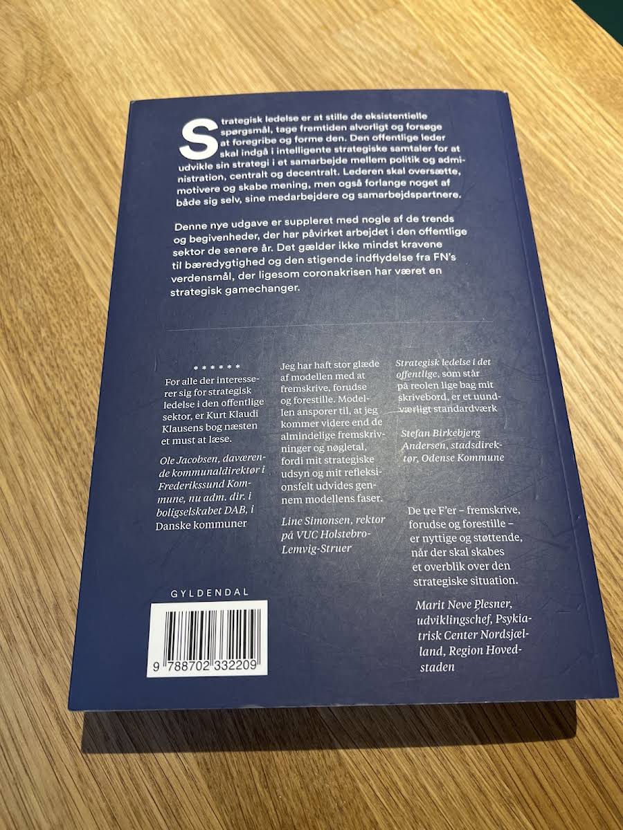 Siden første udgivelse i 2014 har Strategisk ledelse i det offentlige markeret sig som et uundværligt værktøj for den ambitiøse offentlige leder. I denne anden udgave, udgivet i 2021 af Gyldendal Business, samles over 30 års forskning og indsigt fra professor Kurt Klaudi Klausen, med henblik på at imødekomme samtidens krav og udfordringer. Bogen er opdateret med de væsentlige tendenser og omvæltninger, der påvirker den offentlige sektor i dag – herunder de øgede krav til bæredygtighed, den stigende betydning af FN’s verdensmål samt de institutionelle ændringer, som blandt andet er blevet tydelige under coronakrisen. Den fremhæver behovet for at gå ud over den daglige drift og igangsætte en strategisk tænkning, der både forudser og former fremtiden. Med sine tre centrale F’er: Fremskrive, Forudse og Forestille, understreger bogen, at den offentlige leder ikke blot skal optimere arbejdsprocesser og skabe et stærkt internt fællesskab, men også tage et aktivt ansvar for at udvikle og genopfinde organisationens fremtid. Strategisk ledelse i det offentlige er dermed en opfordring til at stille de svære spørgsmål og agere proaktivt i en verden i rivende forandring.