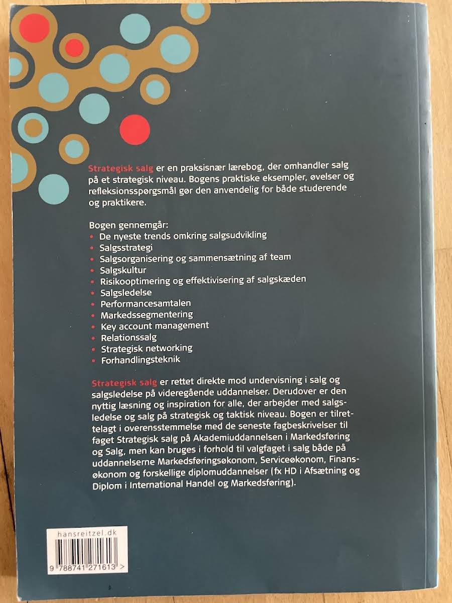STRATEGISK SALG er en praksisorienteret lærebog, der giver en grundig introduktion til salg på et strategisk niveau. Bogen kombinerer teoretiske perspektiver med adskillige praktiske eksempler og cases, der belyser emner som moderne salgsudvikling, sælgerens rolle, salgsstrategi, markedssegmentering samt organiseringen og sammensætningen af salgs-teams. Desuden behandler bogen aspekter som key account management, salgsledelse, performancesamtalen, salg gennem netværk og sociale medier, relationssalg og projektsalg, forhandlingsprocesser, salgskultur og risikostyring i salgsarbejdet. Bogen er udarbejdet med tanke på både studerende og praktikere og er særligt velegnet til undervisning på videregående uddannelser. Den er struktureret, så den opfylder pensumkravene for faget Strategisk salg på Akademiuddannelsen i international handel og markedsføring, og den kan anvendes på andre uddannelser såsom Markedsføringsøkonom, Serviceøkonom, Finansøkonom og Diplom i International handel og markedsføring. Forfattet af erfarne undervisere og praktikere – Søren Hilligsøe, Claus Thomsen, Brian Kruse Jacobsen, Niels Holme og Susie Agerbo Lynge – er bogen et solidt redskab til at navigere i de dynamiske krav, der stilles til nutidens salgsprofessionelle.
